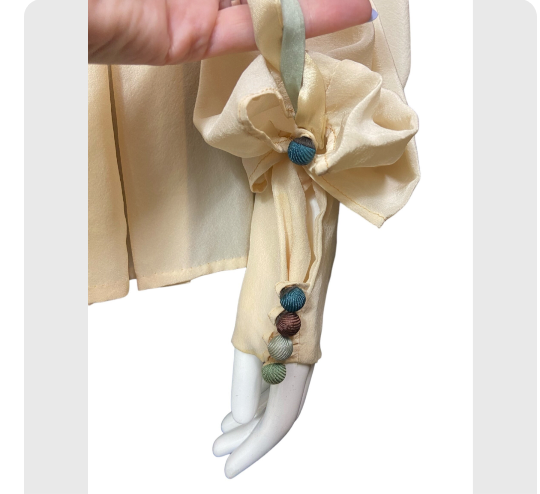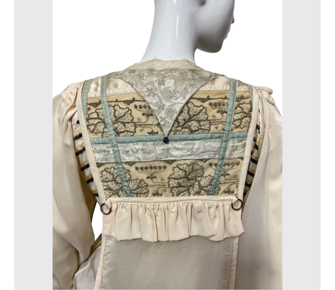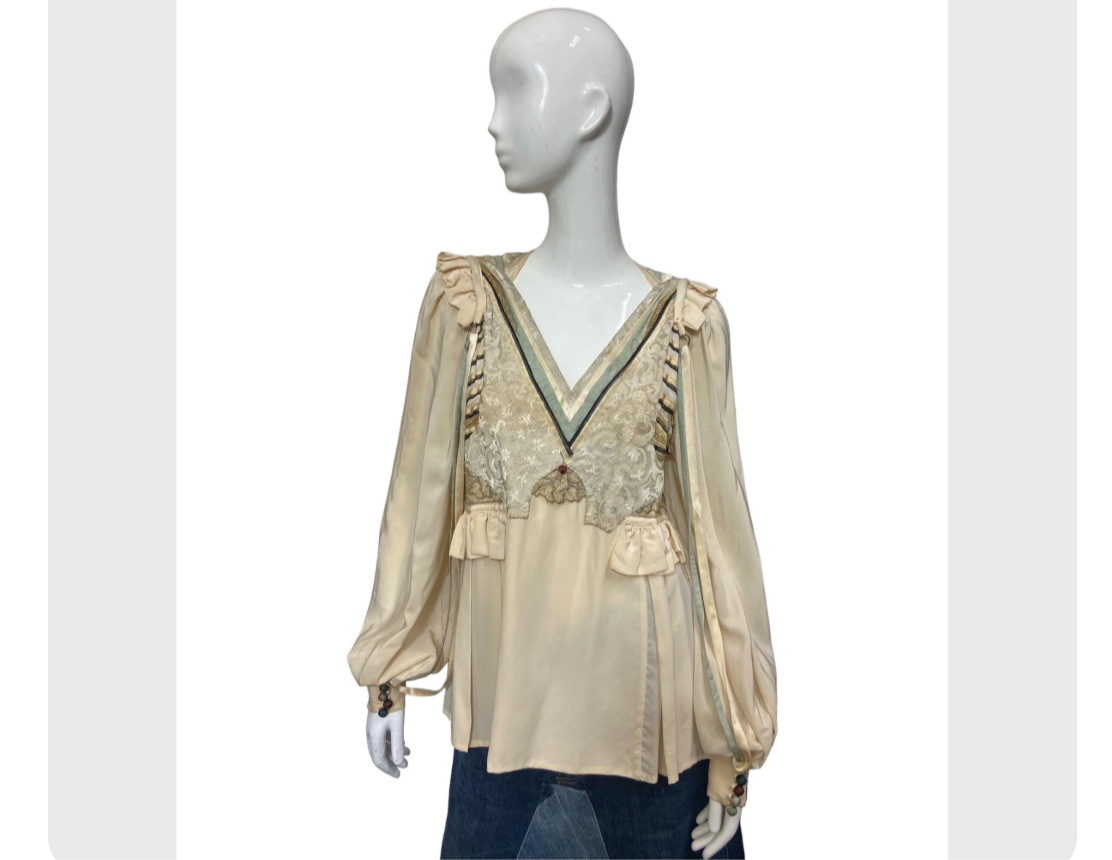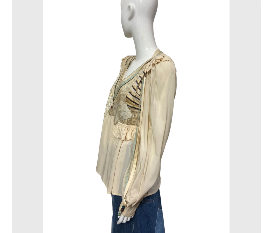 A fairytale, art-to-wear 70’s blouse made in France by Galiane Paris for Saks Fifth Avenue! Cream silk is cut in a relaxed, bohemian fit thru body, with voluminous poet sleeves. Romantic patchwork on upper front and back yoke includes brocade, net lace and ribbon. Ruffle trim on shoulders and below patchwork on front and back. Satin straps decorate sleeves, connected on front of shoulders with metal rings, and extending down to cuffs where they fasten with a bauble button. Two snaps, also at top of cuffs, fasten the sleeve fabric in pleats. Four different colored bauble buttons, in forest green, grey, brown and teal, close the cuffs.