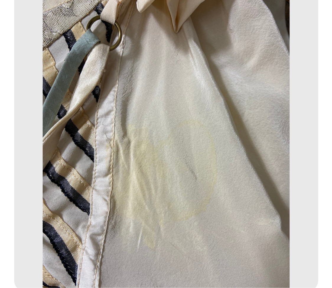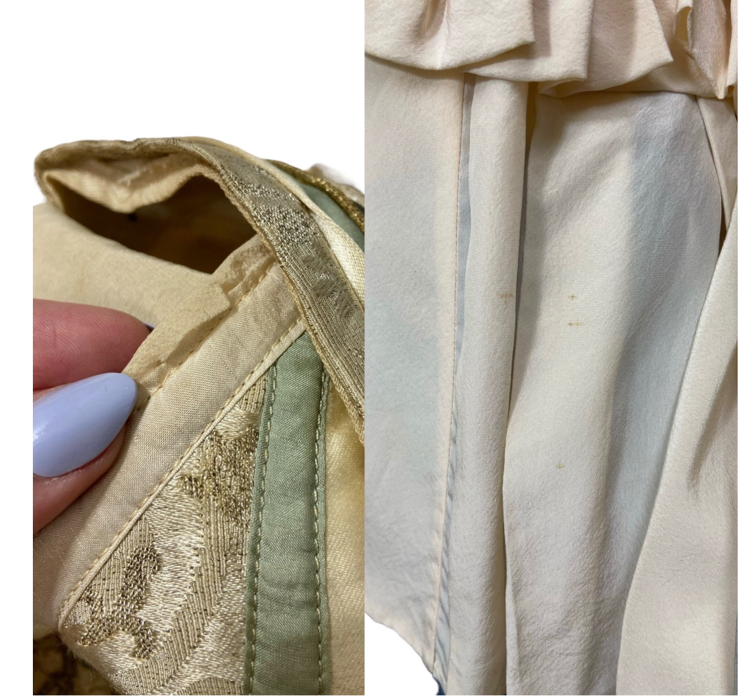 In good condition, with some flaws. There are a few little spots on lower f/l, as well as some light dinginess/discoloration on back of cuffs and back interior lining. Two little blue pen marks on left shoulder. Small tear on seam of left cuff that’s hidden by sleeve folds. There’s also some light yellow underarm discoloration.