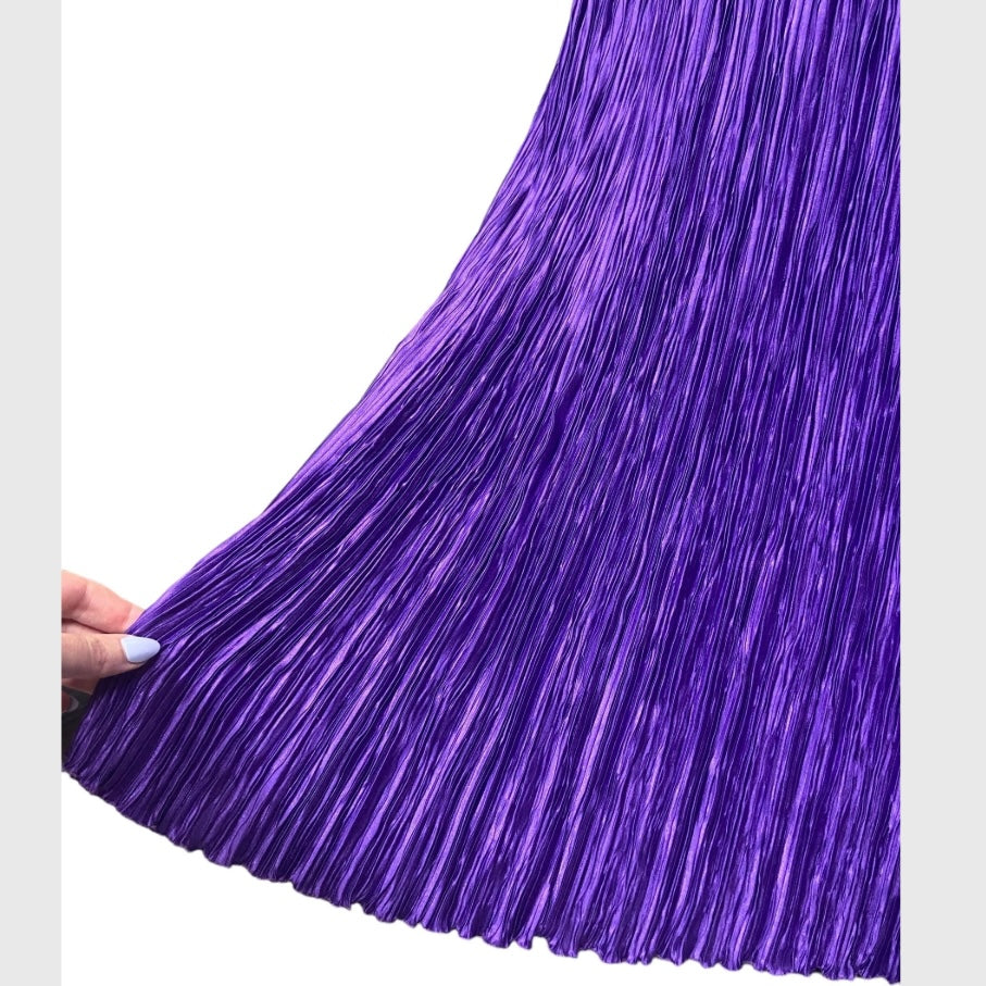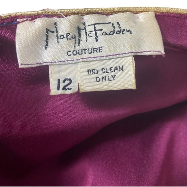A sophisticated one-shoulder column gown by singular designer Mary McFadden! This 80’s piece is color-blocked in jewel tones, in her signature “Marii” fabric (a synthetic satin charmeuse that’s pressed in plisse pleats). This flattering fabric highlights curves while concealing flaws. Sapphire blue, fuschia and royal purple color scheme is separated with gold metallic piping. Lined in fuschia synthetic satin. Closes on side with a hidden nylon zipper.