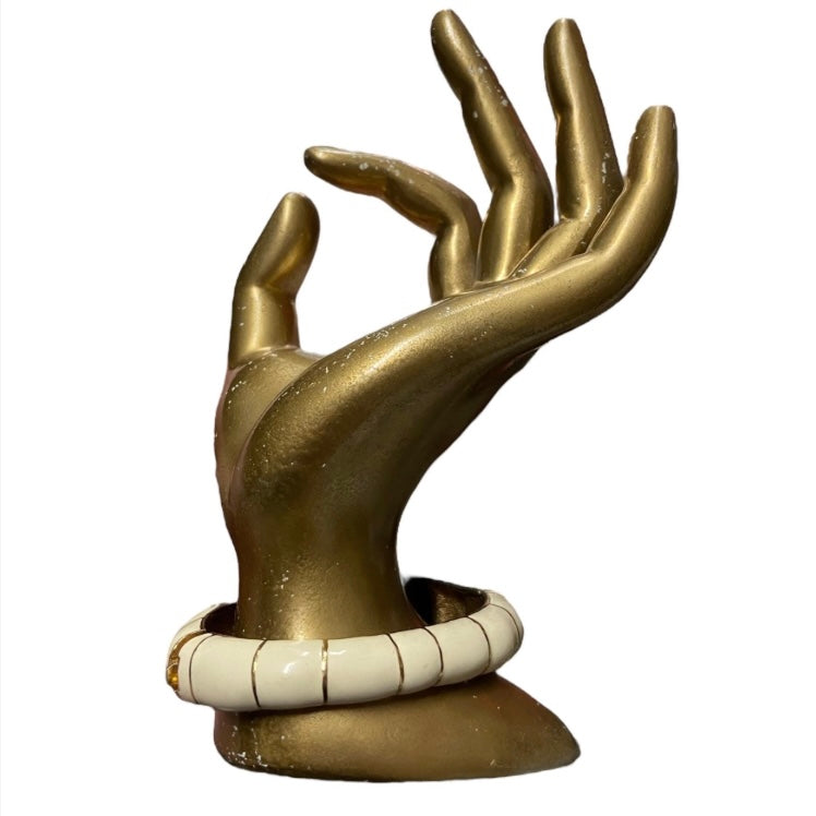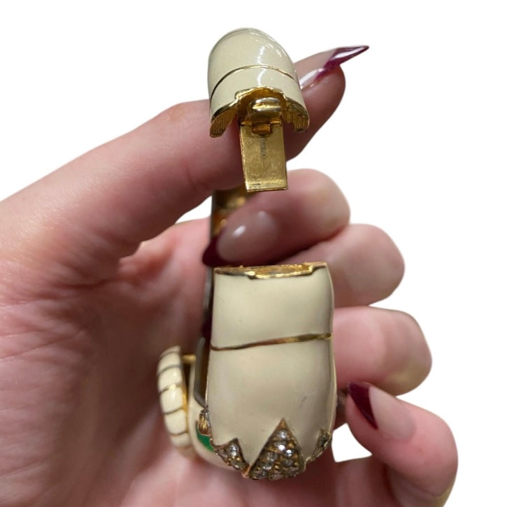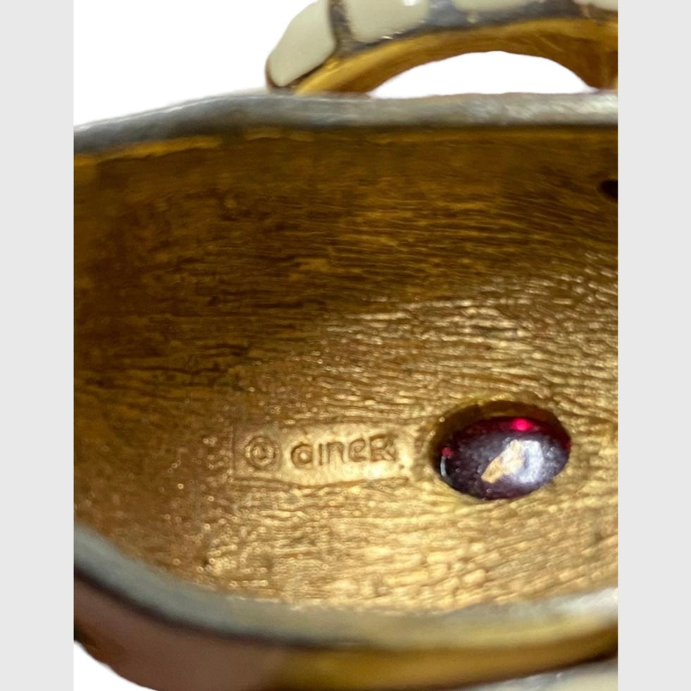 A glamorous, Deco inspired bracelet by renowned costume jewelry company Ciner! Gold tone metal base is covered with ivory colored enamel. Handsome, well-crafted ram’s head is accented with green glass cabochon eyes and a garnet colored cabochon sat in a panel of rhinestones, in between horns. Rhinestone encrusted bit in its mouth connects to rhinestone encrusted petals on other side. Opens with a hinge and a hidden box clasp. Stamped with multiple signatures on underside of bracelet.
