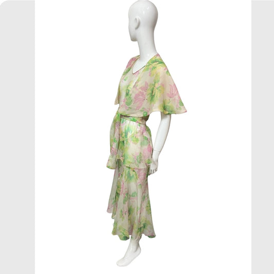 30’s Pink & Green Floral Print Silk Crepe Dress with Matching Capelet and BeltRegular price $498.00 USDRegular priceUnit price / per-