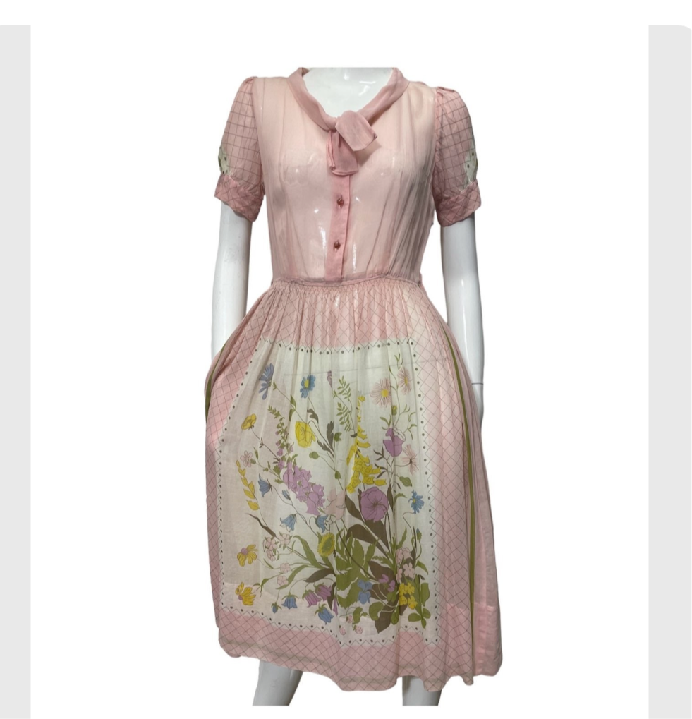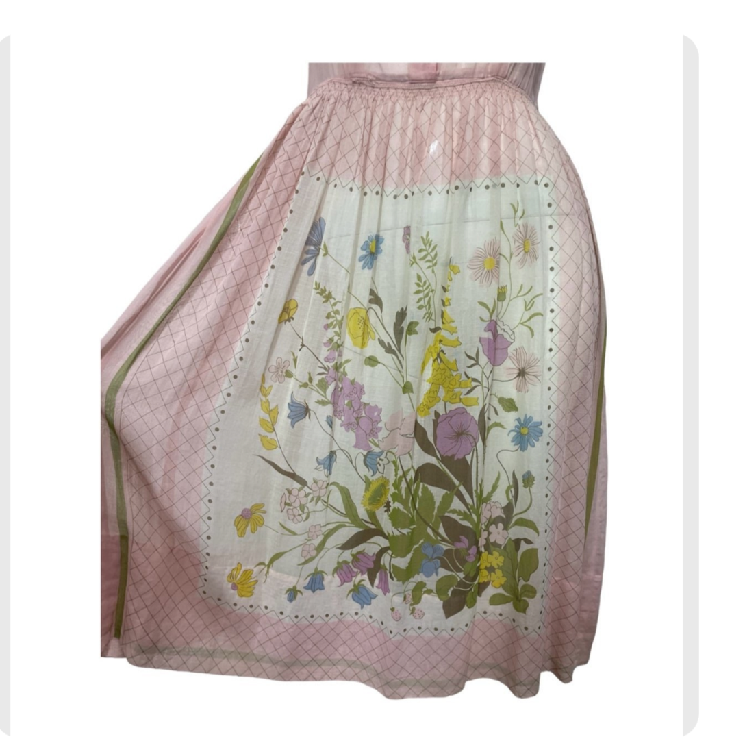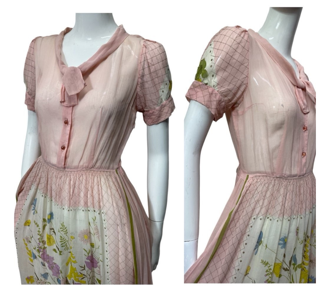 Charming late '40s early '50s cotton voile sheer summer dress with charming apron style print of flowers in a garden on the front. V-neck with fold over sash sewn on collar was cute bow tie neckline button down front with pink hue clear plastic round buttons . The skirt has an apron appearance with down the front a panel of garden flowers framed in checkerboard in polka dots the same fabric is used on the sleeves they're capped with very cute tiny pleats . The flowers are honeysuckle dandelions violets daisies poppies a beautiful garden variety