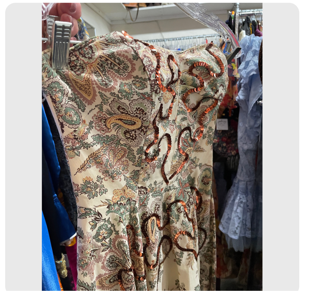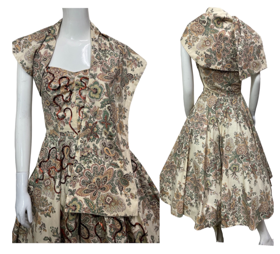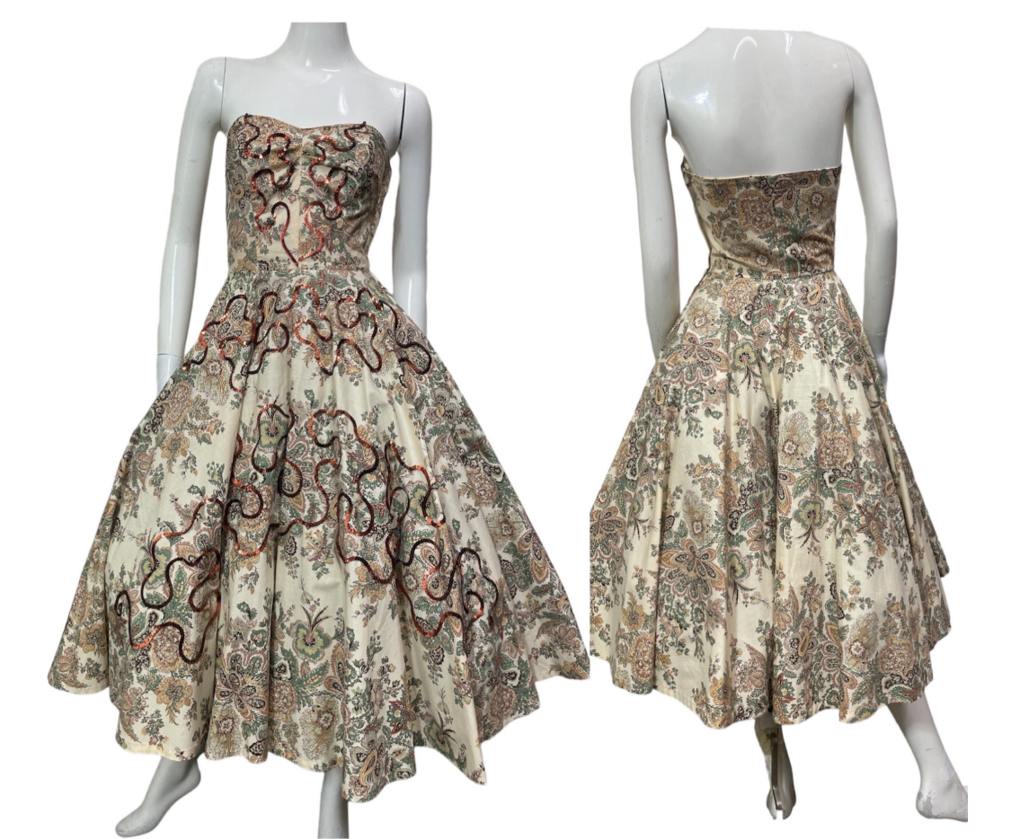 1950s strapless paisley print sequined dress