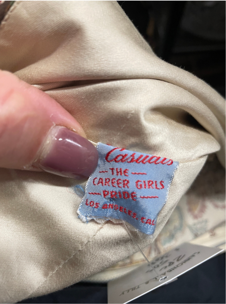 This dress features a strapless, fitted bodice and a full, knee-length skirt. The polished cotton fabric is adorned with a detailed floral Jacobean paisley print, in brown, gold, olive, and black accented with brown sequin embroidery . The back view shows a simple, fitted design. It has an invisible side metal zipper closure. or embellishments. There is a side metal zipper. Its a classic 1950s silhouette with lovely ornate detailing.