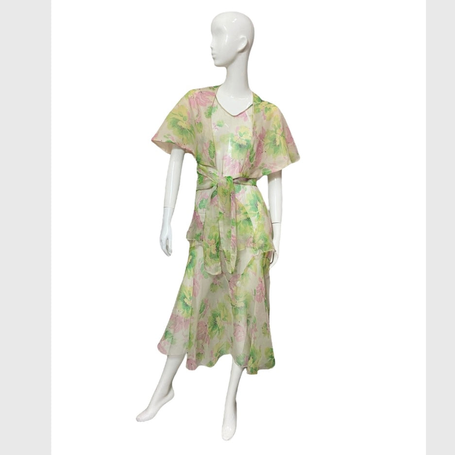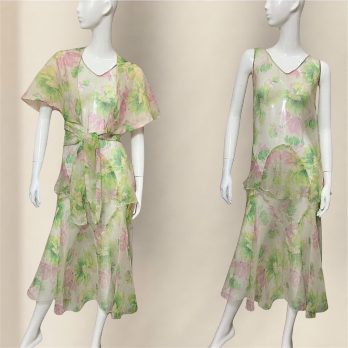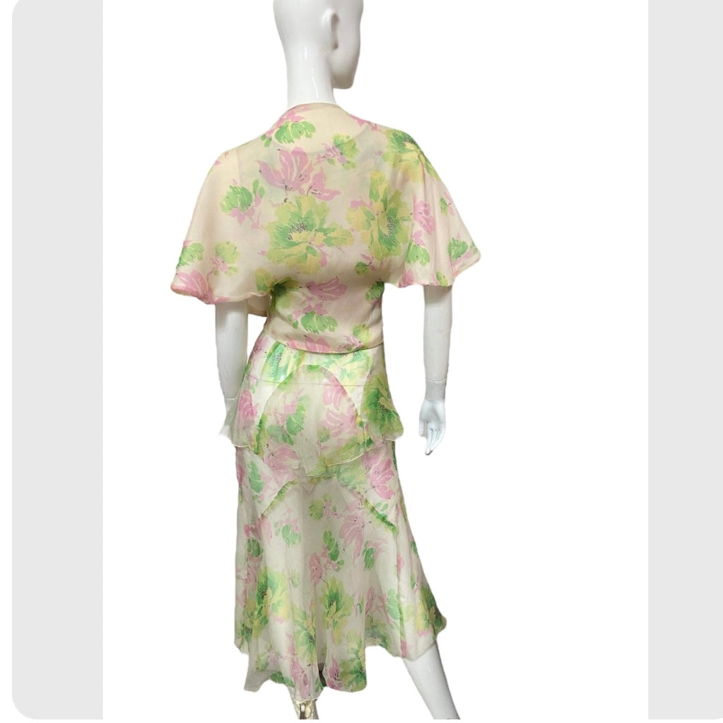 30’s Pink & Green Floral Print Silk Crepe Dress with Matching Capelet and Belt