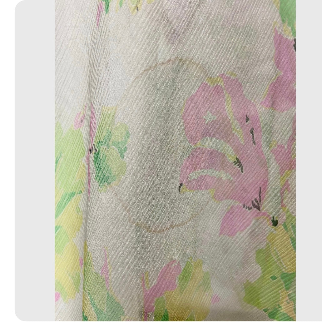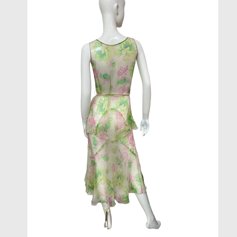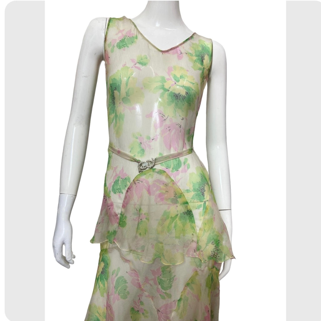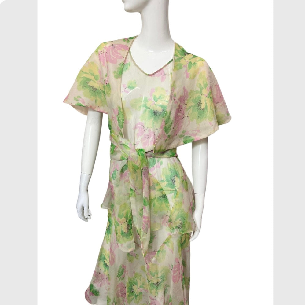 30’s Pink & Green Floral Print Silk Crepe Dress with Matching Capelet and Belt