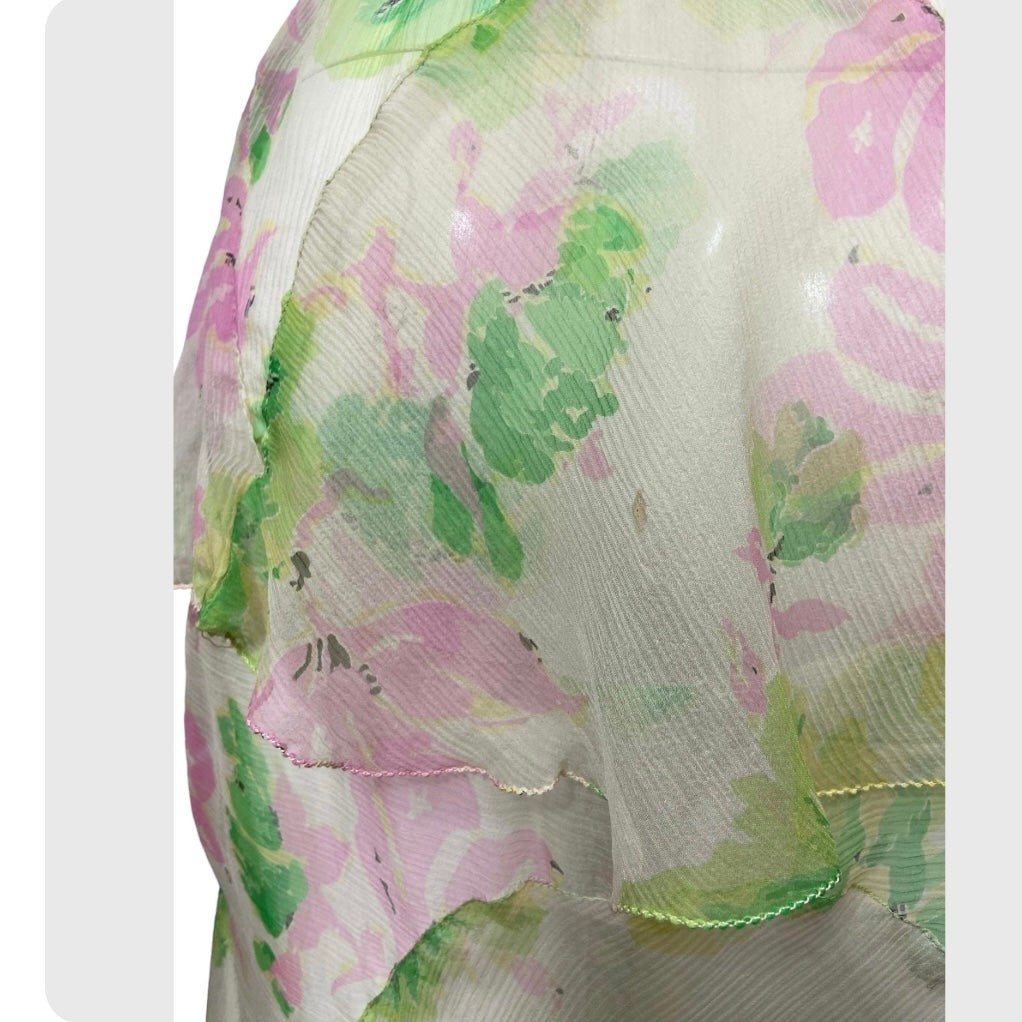 Presents well and is in good condition with some flaws. There’s a liquid halo stain on lower part of back skirt that is somewhat obscured by the print. Also a small brown spot on back hip ruffle. A few pinholes on shoulder straps. Minor underarm discoloration, and a few light marks on lining of capelet. Small section of separation between capelet fabric and lining on back of neck. Belt buckle is missing many rhinestones, including center baguette. Also, and most strangely, there’s a little scrap of what looks like pattern paper trapped in between the two layers of silk of capelet’s waist tie (along with some visible threads at seams).
