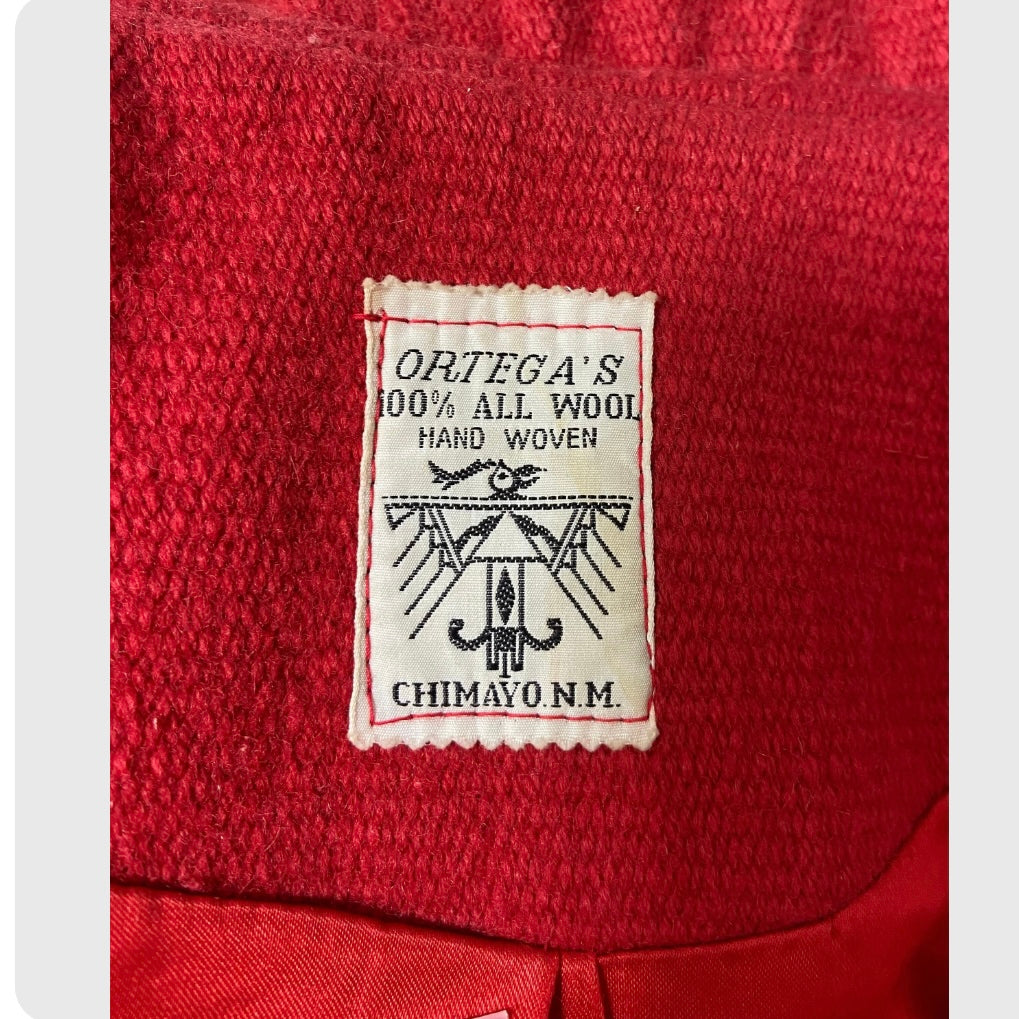 A striking Chimayo poncho style jacket made in the 50’s by Ortega’s of Chimayo, New Mexico. Hand woven, 100% wool in primary red, with Chimayo motifs (two on front and one larger one on back) in bright turquoise, light grey, black and white. Jacket collar and black braided leather buttons down c/f. Buttons also fasten sides and create sleeves in the poncho style construction. Large patch pockets on lower front. Yarn fringe trim on front and back edges. Red satin lining.