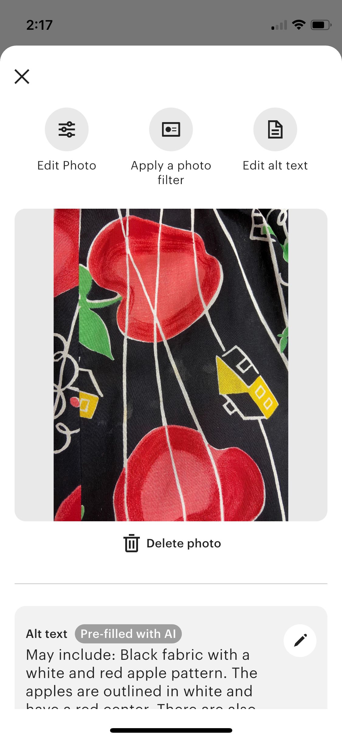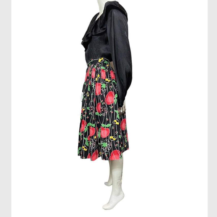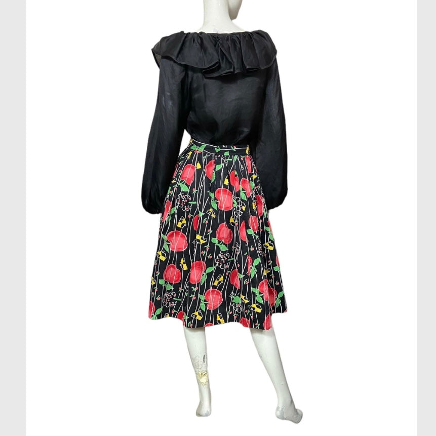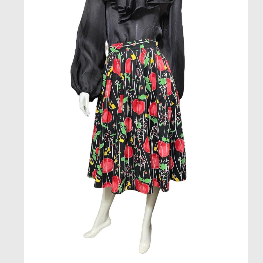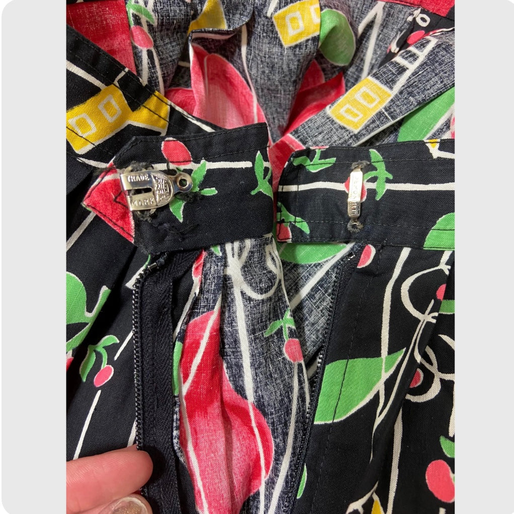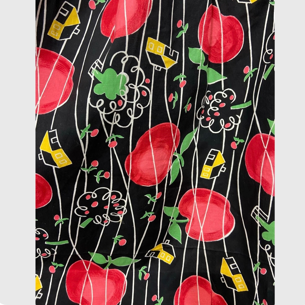 Get back to school with the perfect novelty print! Big red apples, little yellow schoolhouses, squiggly apple trees and wavy white lines against a black background make up the cute stylized print on this mid-c skirt. Not a full circle skirt, but has extra volume from pleats on waist. 1.5” waistband closes on back with a metal hook. Nylon Talon zipper.