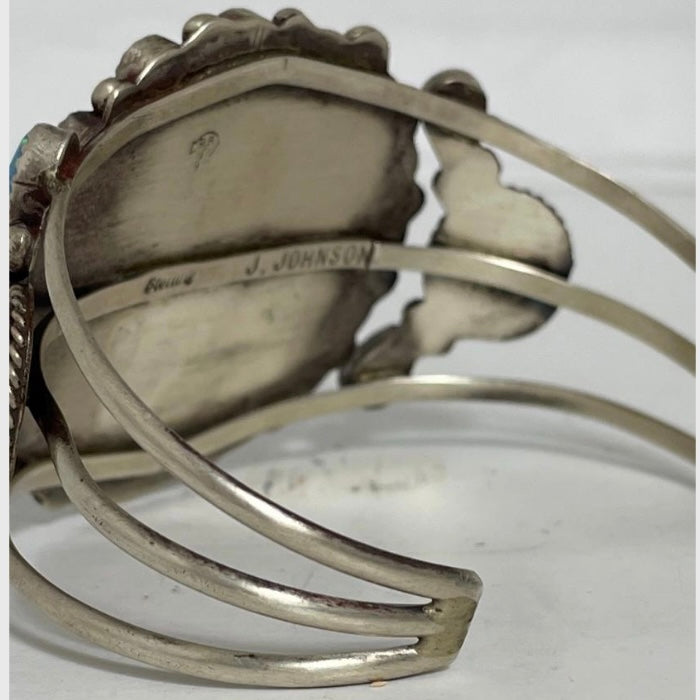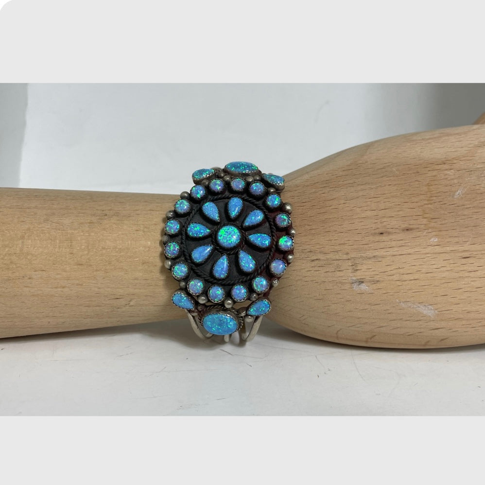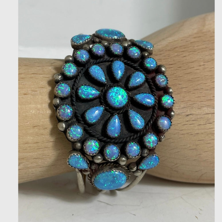 This lovely handcrafted bracelet features a striking cluster design set with numerous lab Blue Opals. The opals are in a vibrant blue hue with flashes of green and hints of purple. The centerpiece stones are set in silver with a lovely aged patina. The bracelet band is constructed of 3 strands of silver connecting at the ends. This is signed by the artist "J. Johnson" and stamped silver. This cuff is a bold and eye catching piece. This is a tiny fracture in one of the silver bands where it is attached to the centrepiece but it is not visible, nor effect the wearing of the bracelet