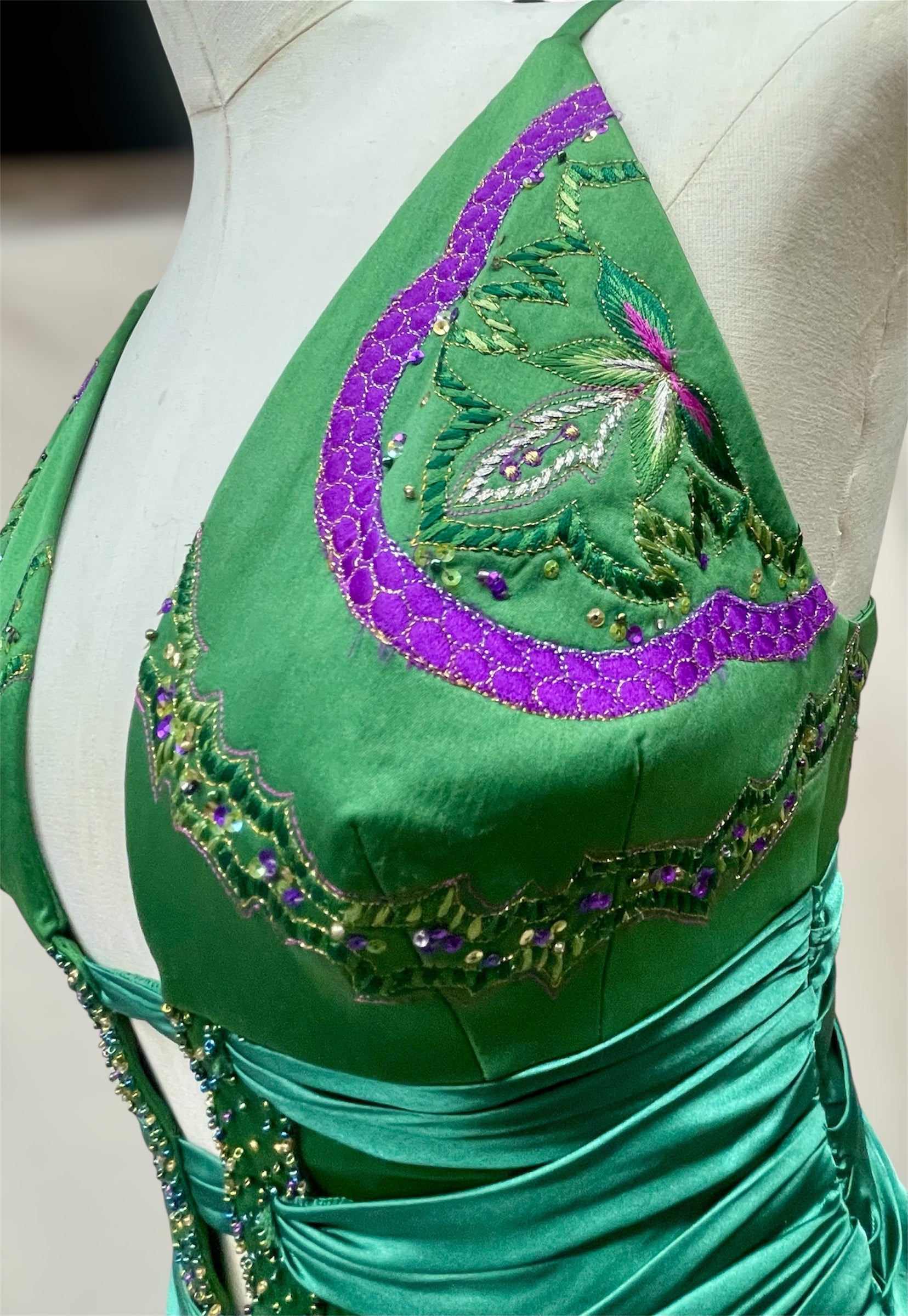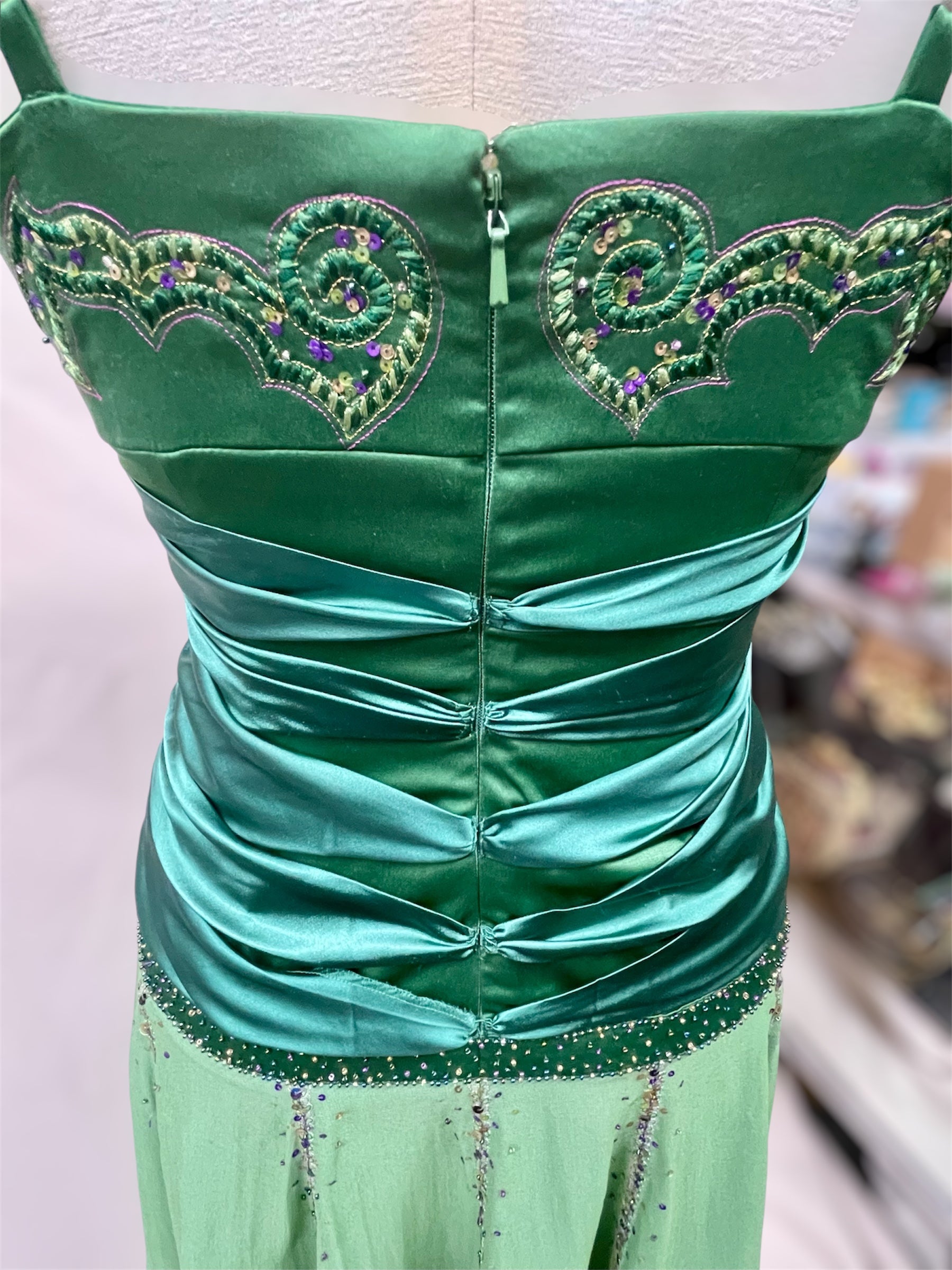 A rare and collectible early 2000s Mandalay dress in deep mossy green. Features adjustable straps, a secure zip back, a fairy hemline with whimsical, asymmetrical drape, and intricate sequin and bead embroidery. Made with slight stretch for a sleek, flattering fit—this piece blends whimsy goth romance with red carpet glamour.