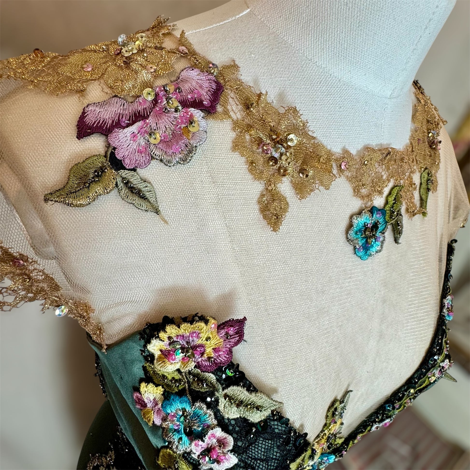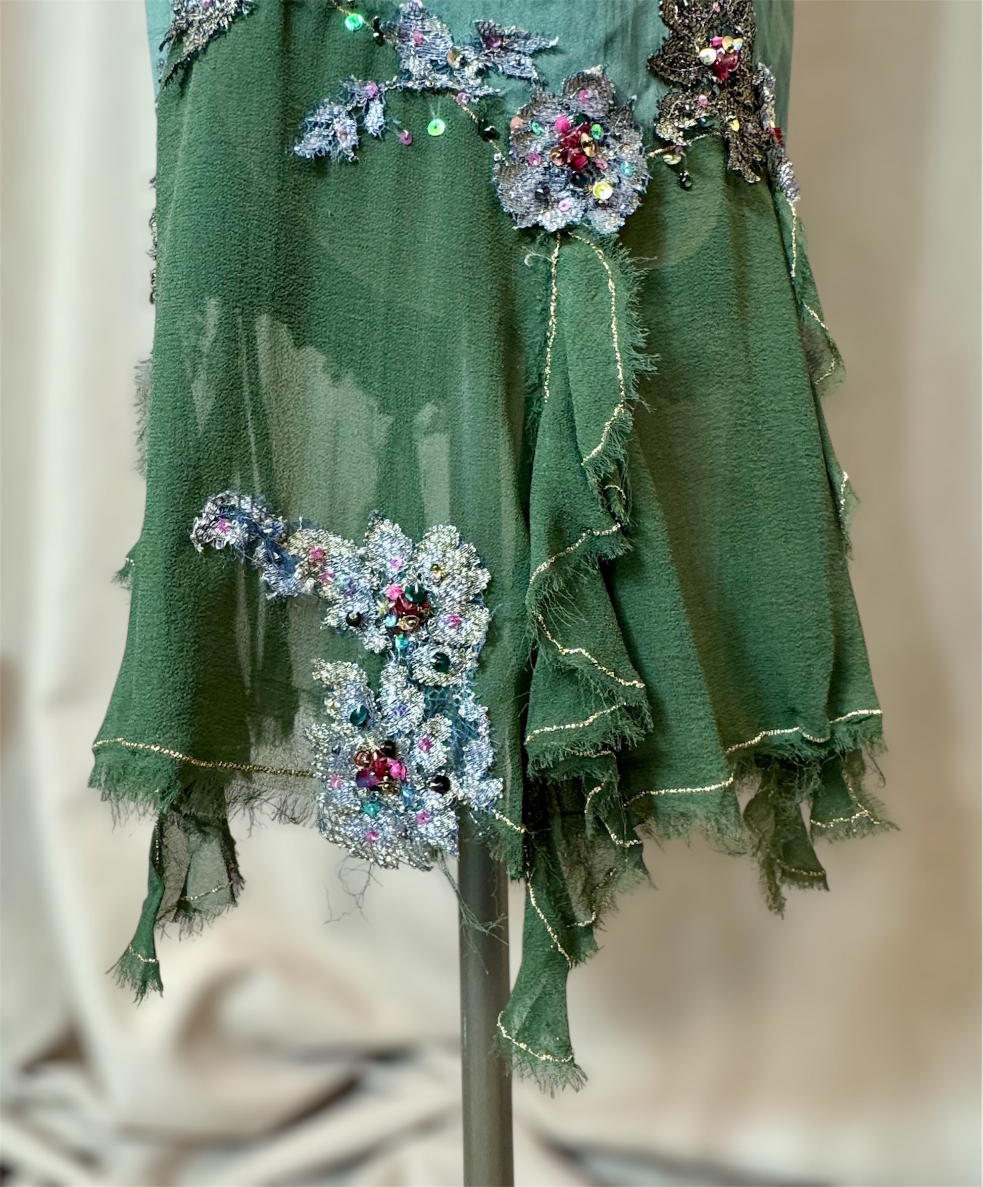 Y2K Deadstock Vintage Mandalay Midi Dress, size 6— green satin with gold lace, sheer mesh cap sleeves, featuring lace appliqué, sequins, and beading throughout, finished with an asymmetrical sheer fairy hem for a whimsical, ethereal Y2K look.