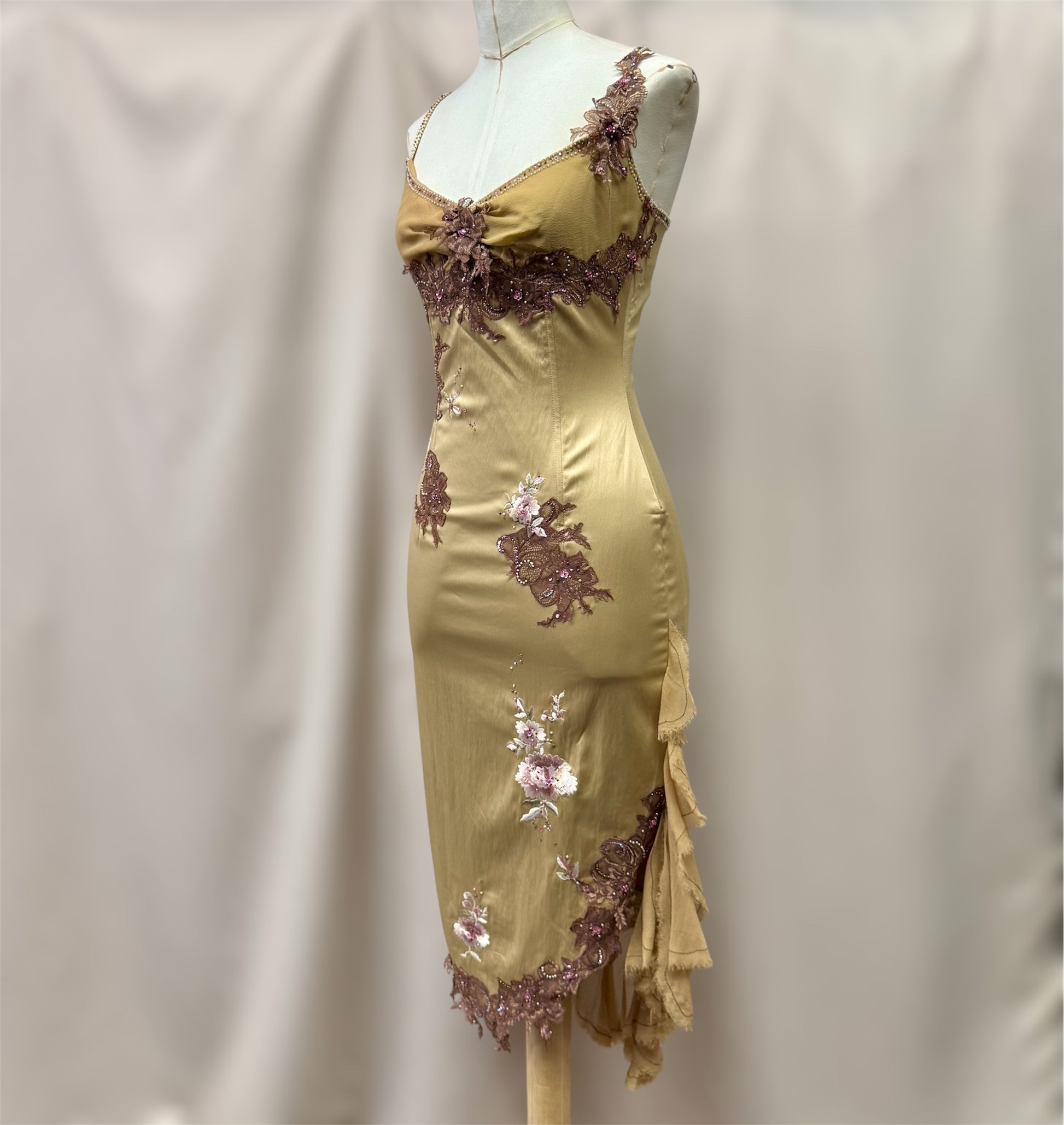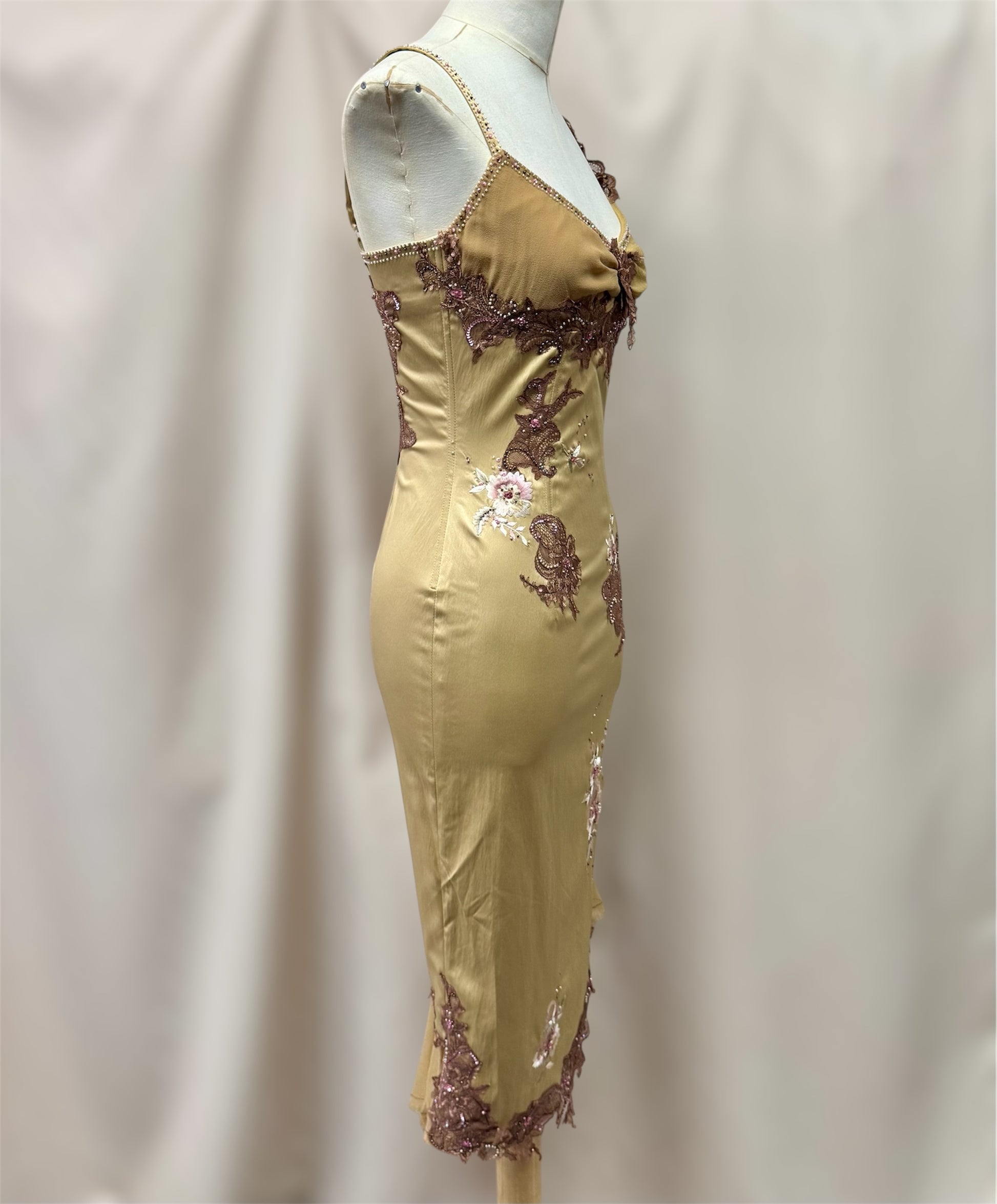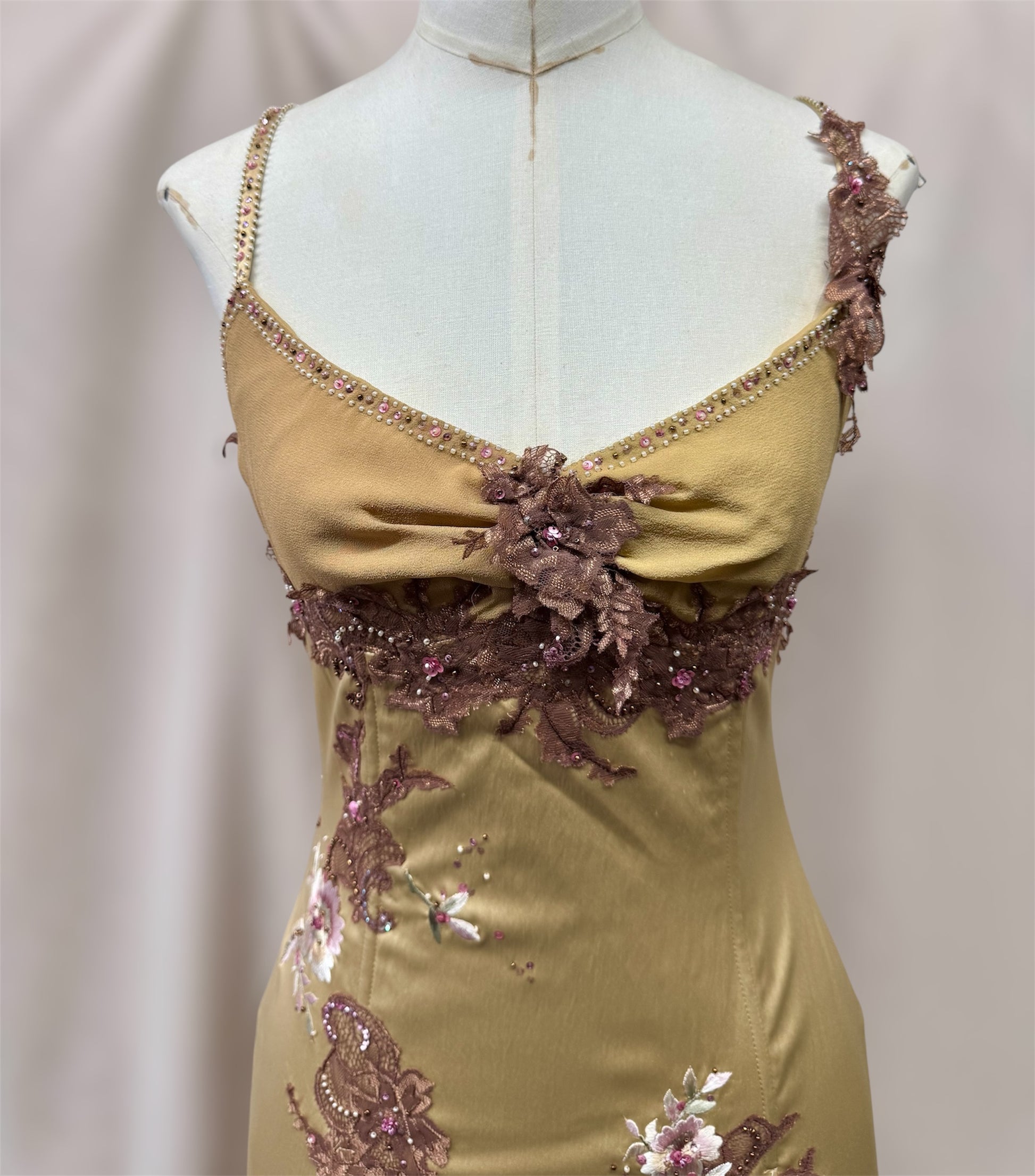 This dress embodies Y2k glamor with its detailed embellishments and fitted silhouette — perfect for collectors or anyone wanting a standout vintage evening piece.