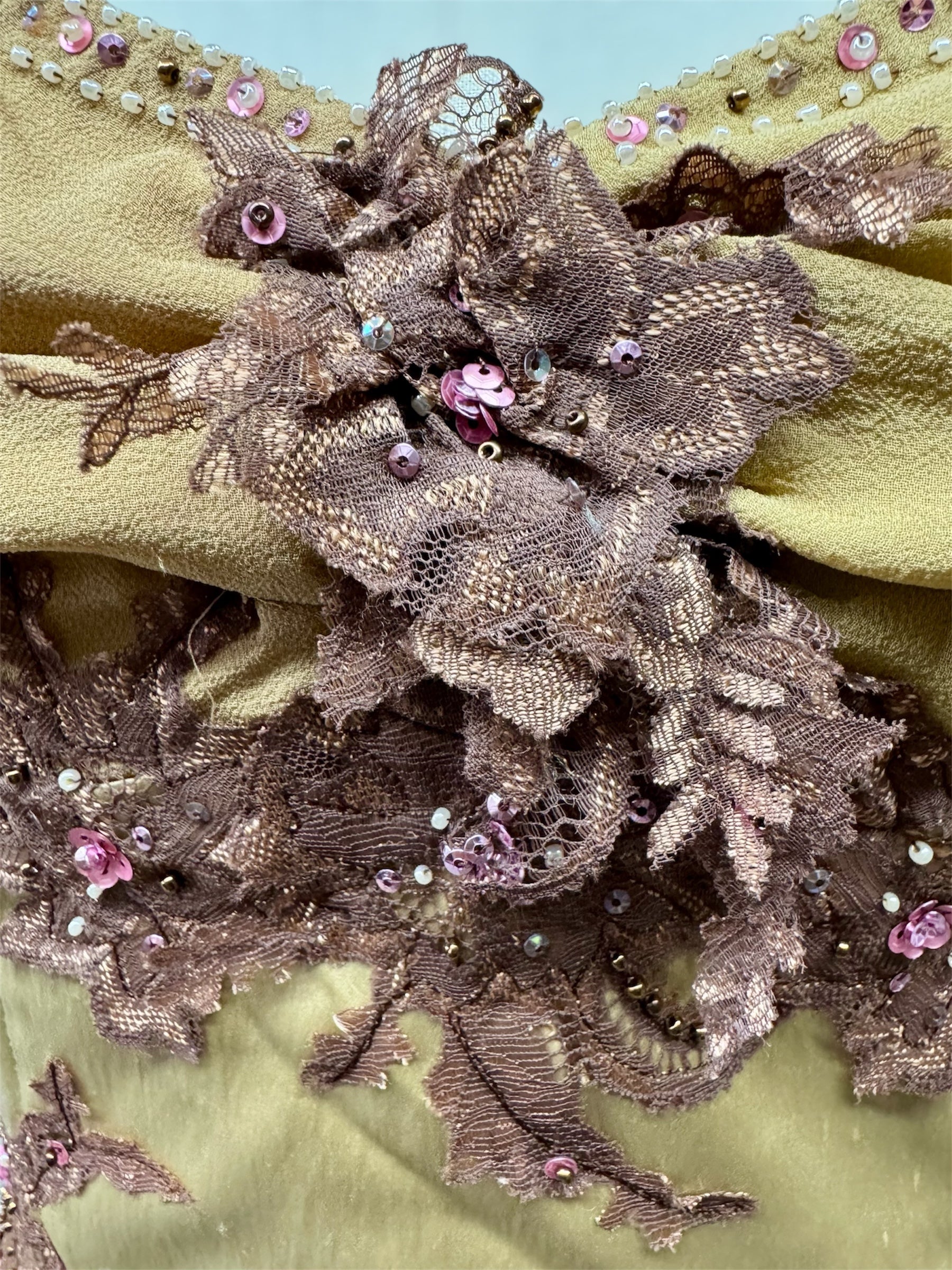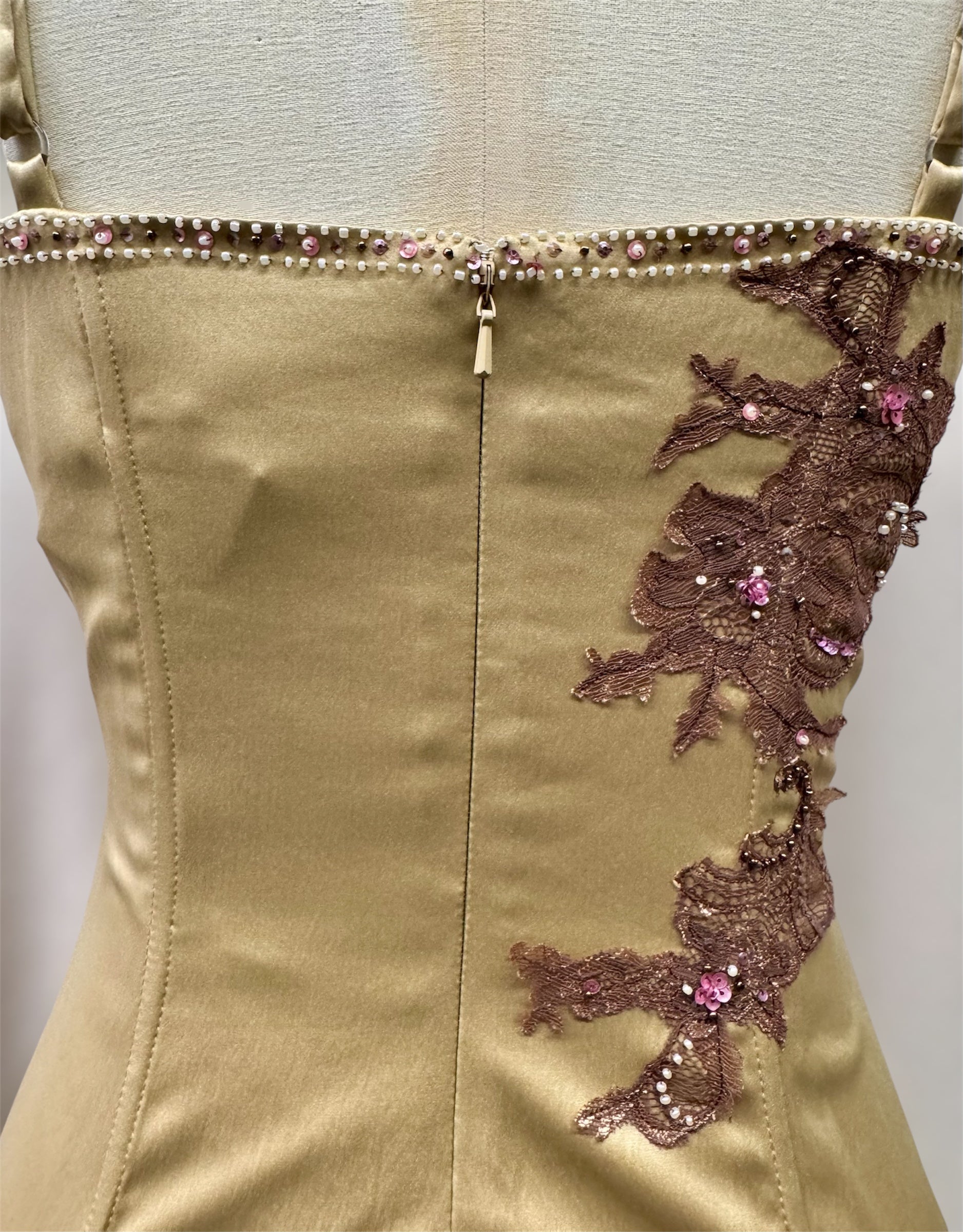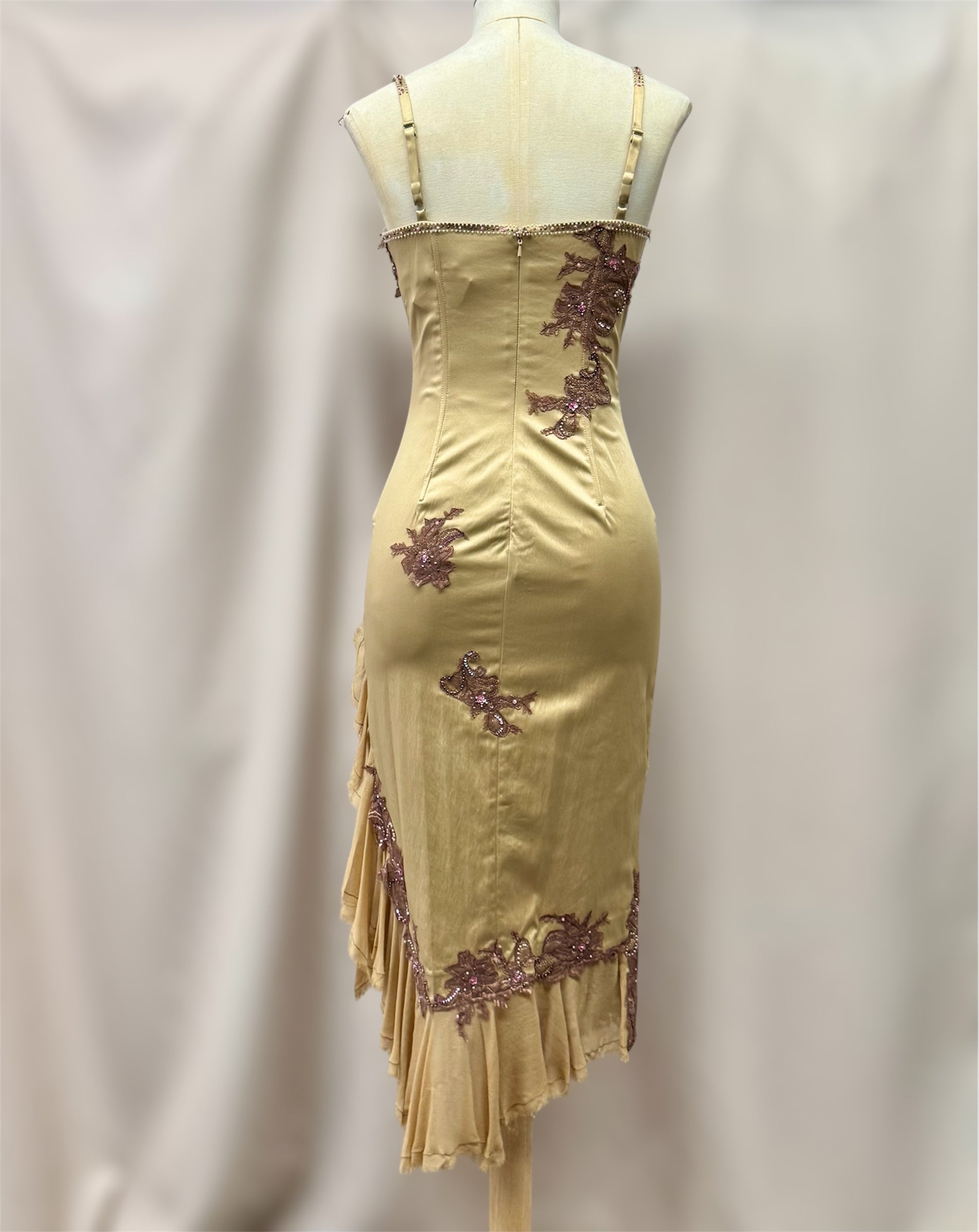This dress embodies Y2k glamor with its detailed embellishments and fitted silhouette — perfect for collectors or anyone wanting a standout vintage evening piece.