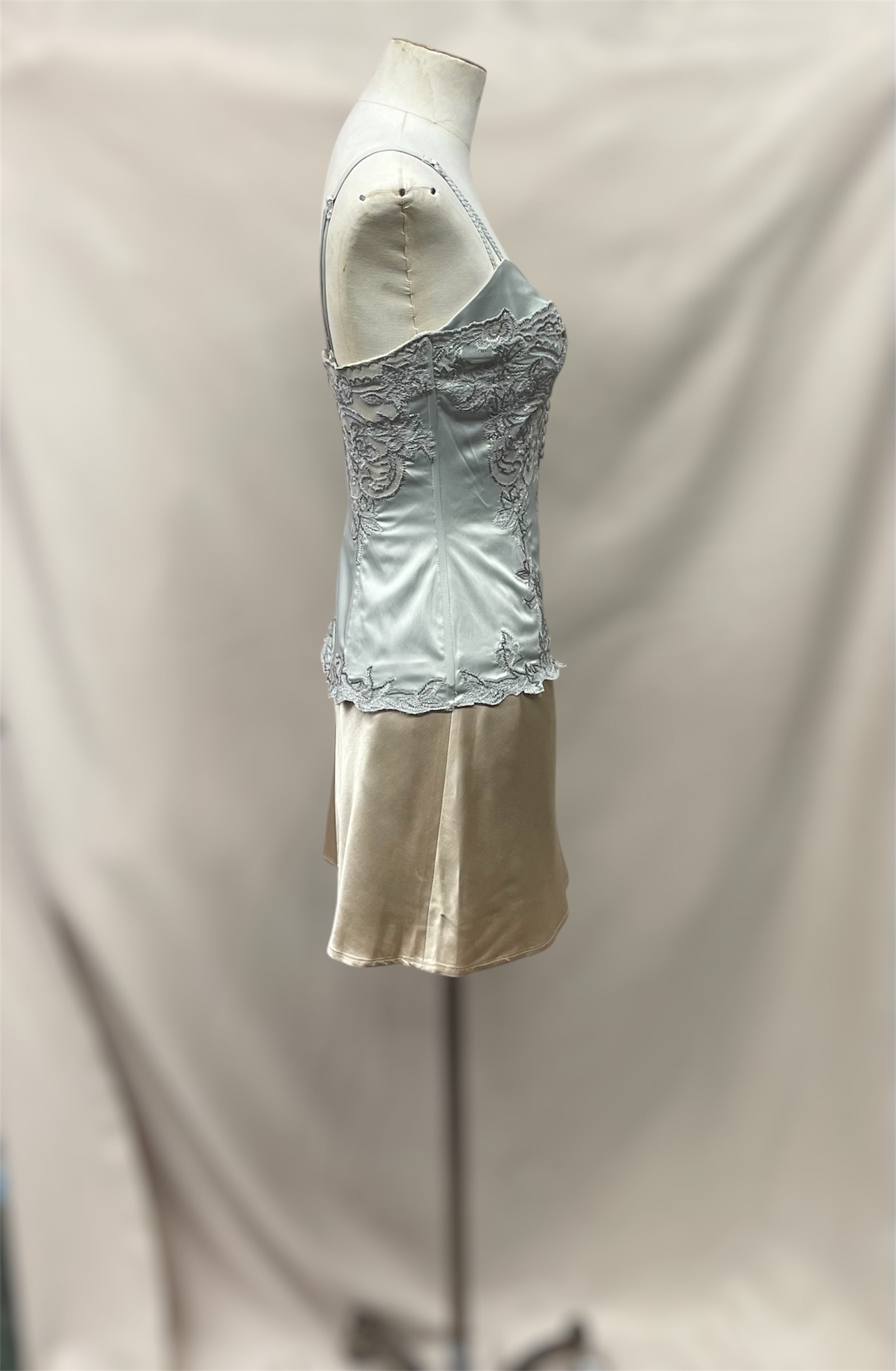 Rare deadstock Mandalay corset-style tank top in a bluish gray shade with sequin and lace embroidery. Features decorative fabric-covered buttons, a zip back, and adjustable straps for a tailored fit. Made from stretch fabric and fully lined for comfort and structure. A stunning piece of early 2000s Mandalay glamour — elegant, romantic, and collectible.