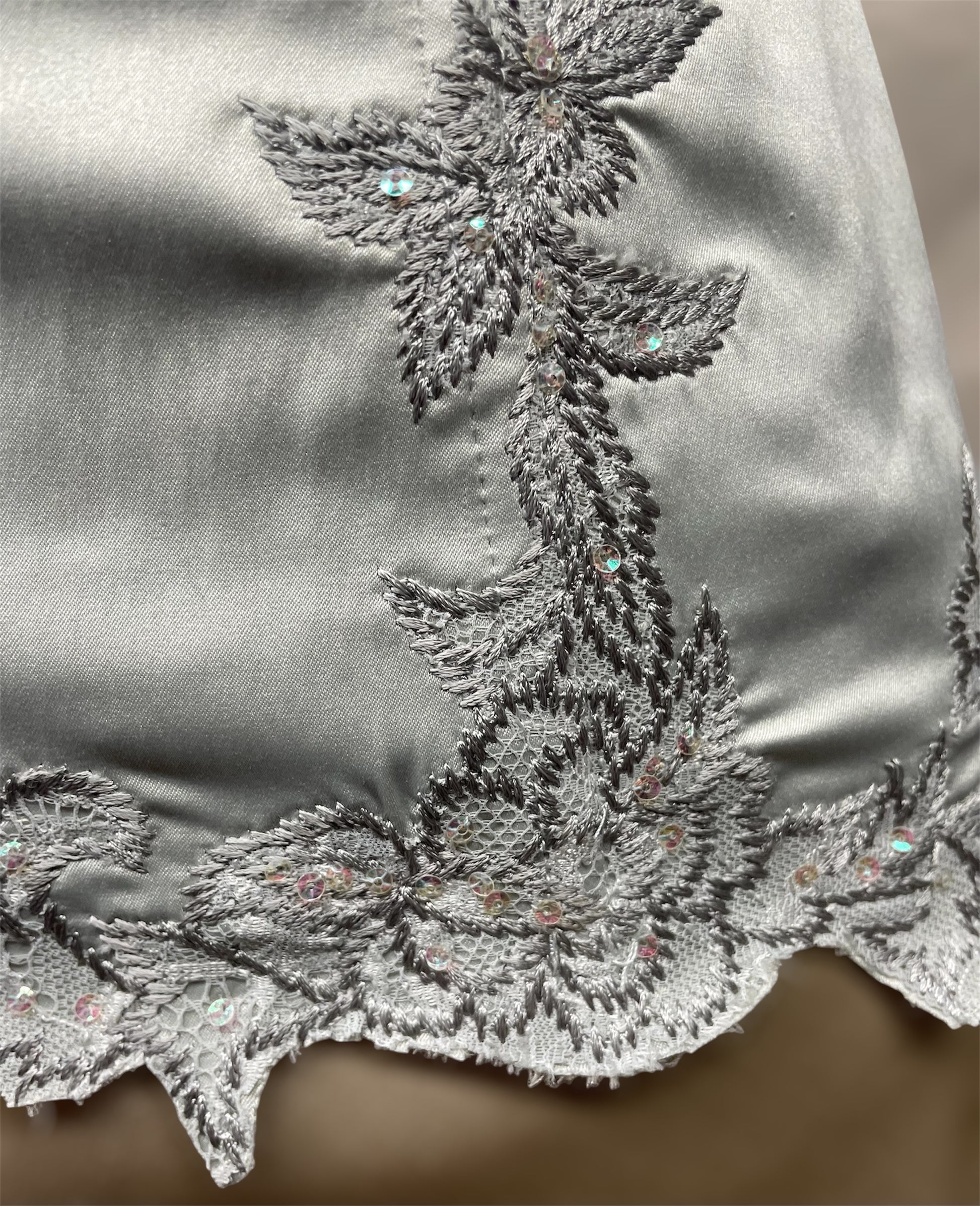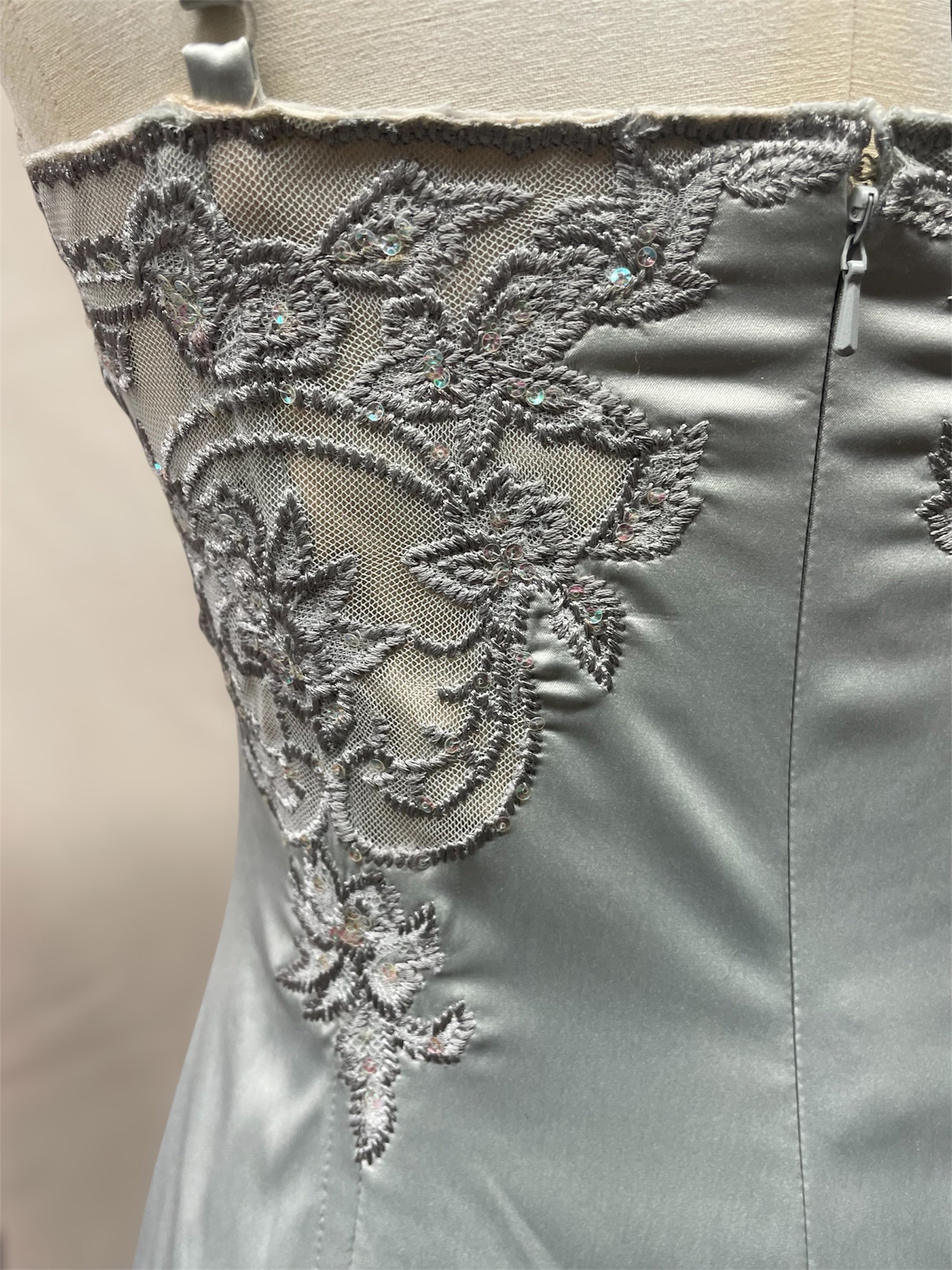 - Features: Sequin and lace embroidery, decorative fabric-covered buttons, zip back, adjustable straps, stretch fit, lined interior