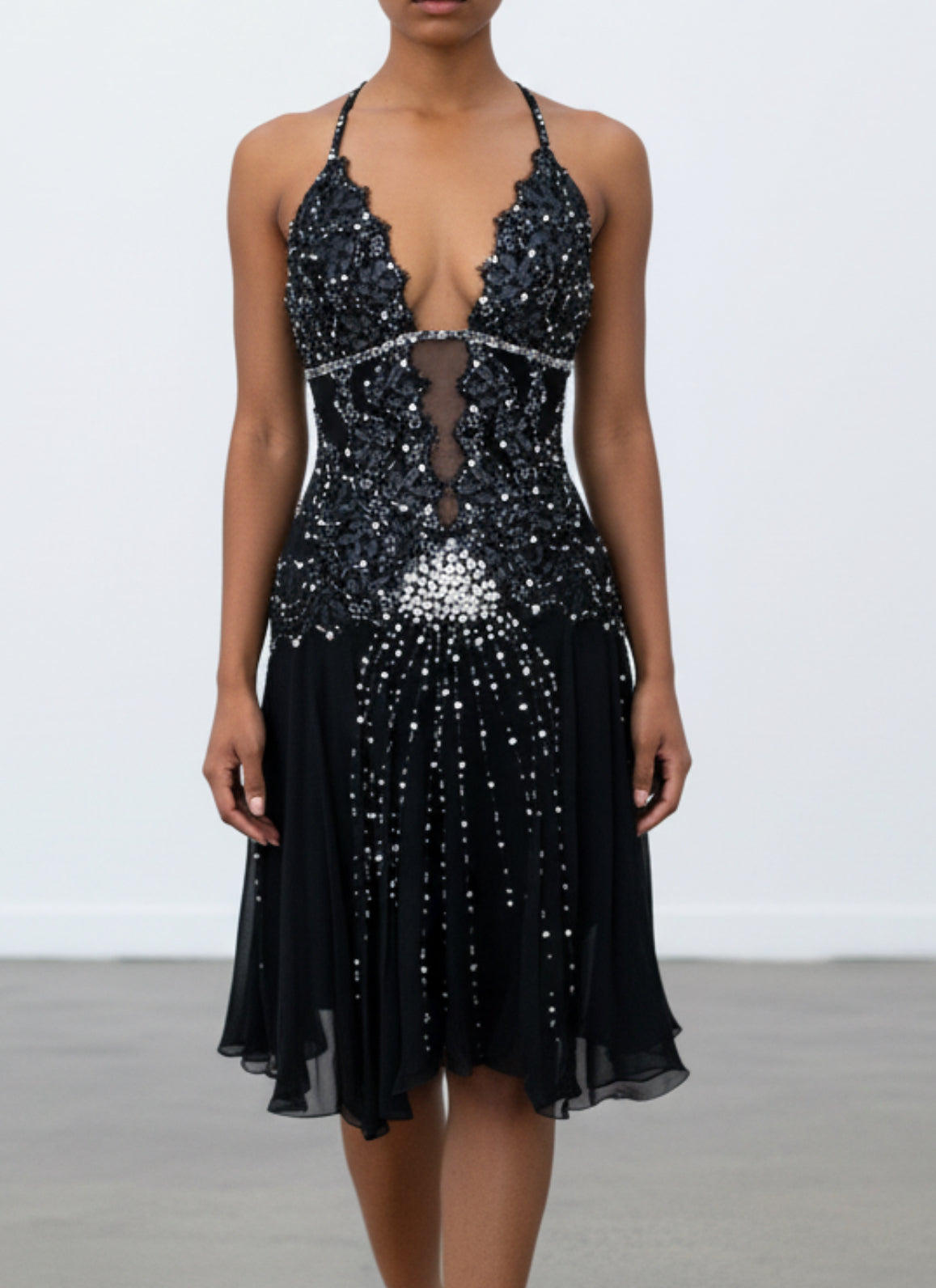 Black with clear rhinestones, silver beading, and sequins