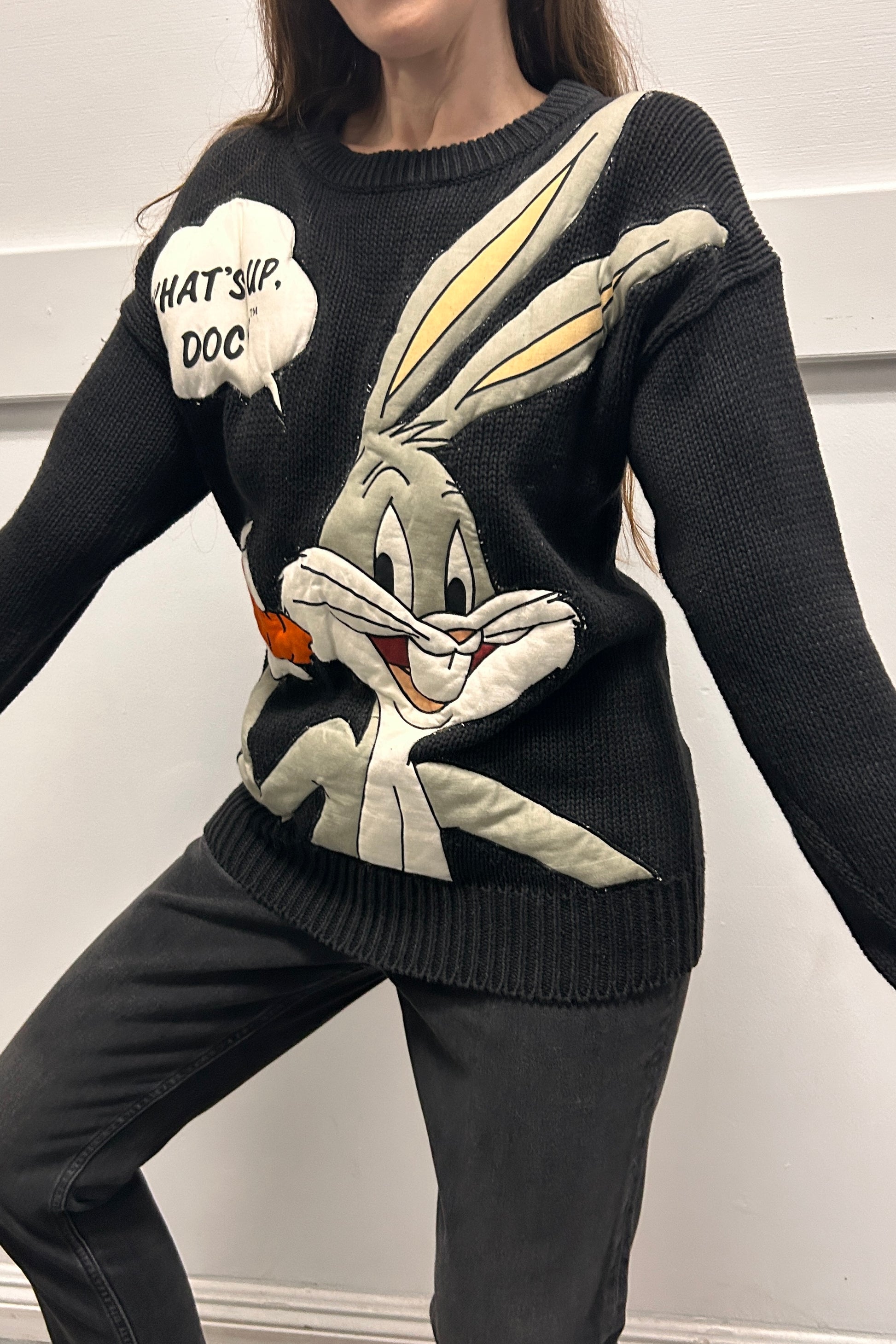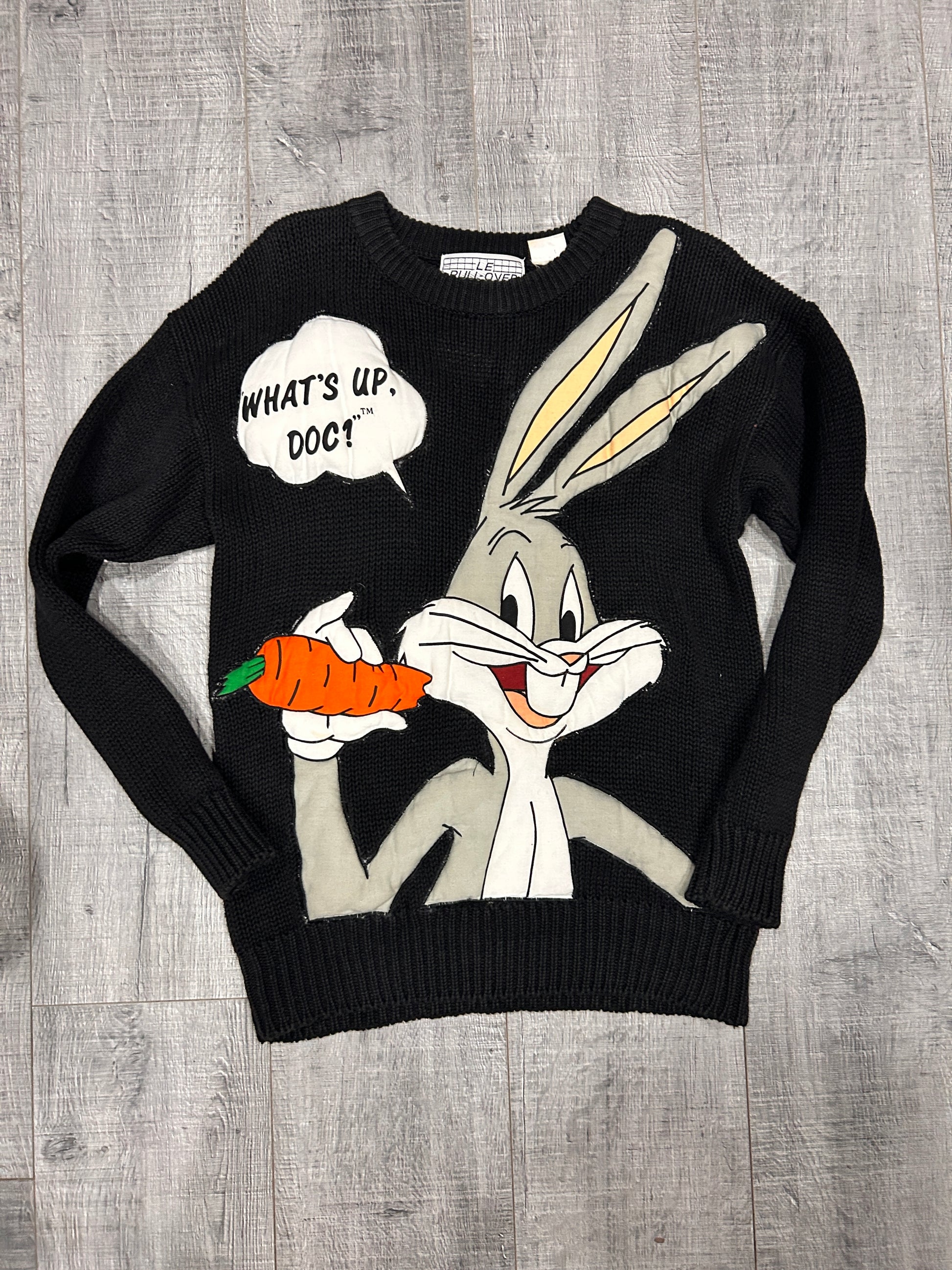 Playful vintage black knit sweater featuring a bold graphic of Bugs Bunny holding a carrot with his iconic catchphrase “What’s Up, Doc?” in a speech bubble. Detailed with bright pops of orange, green, and gray for a cartoon-perfect look. Classic crew neckline with ribbed cuffs and hem for a comfortable fit. Excellent condition, label Le pull-over Irene Leung