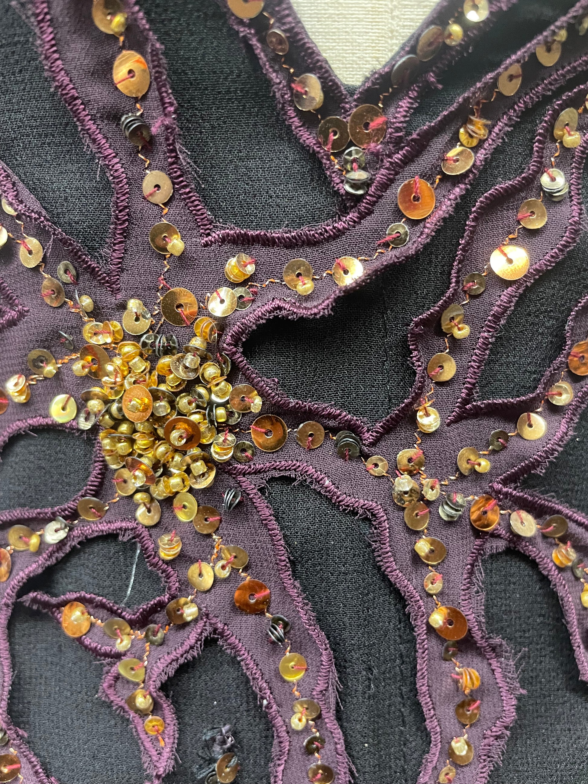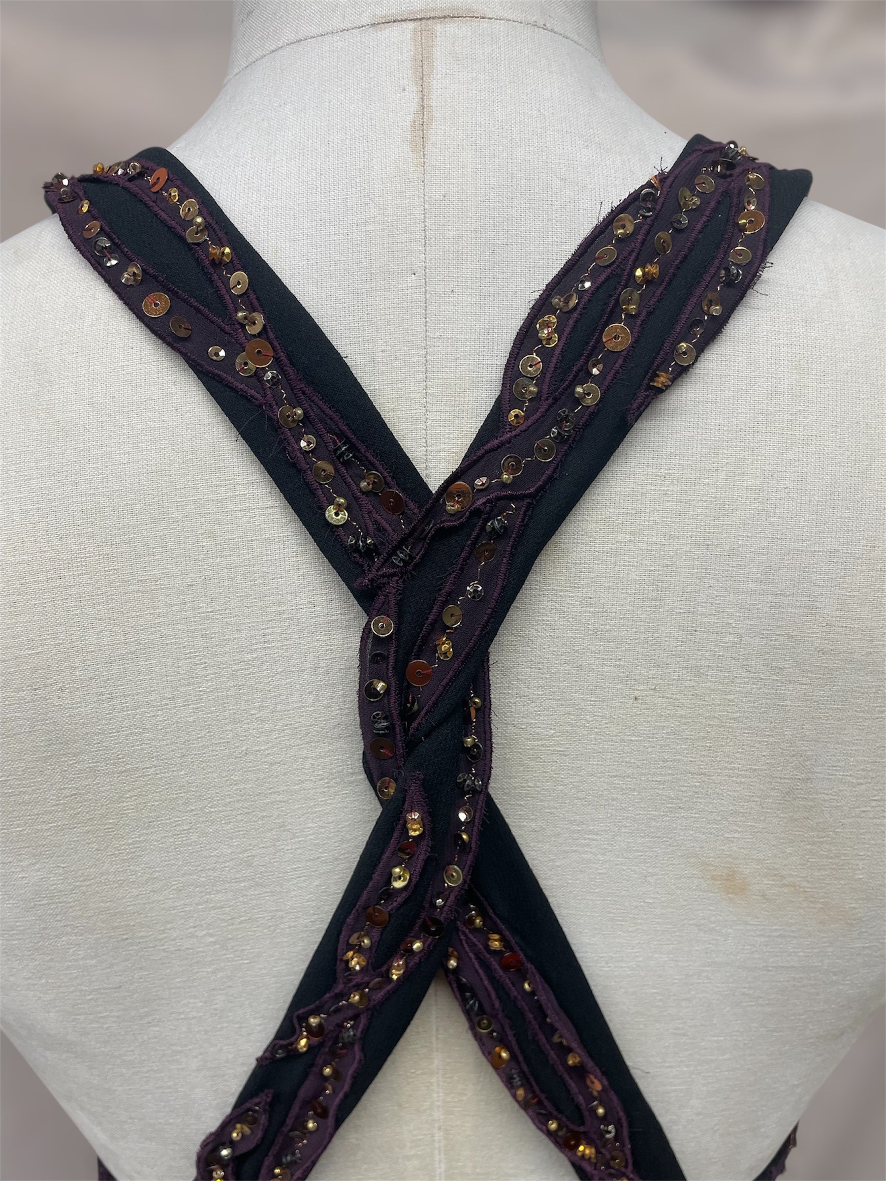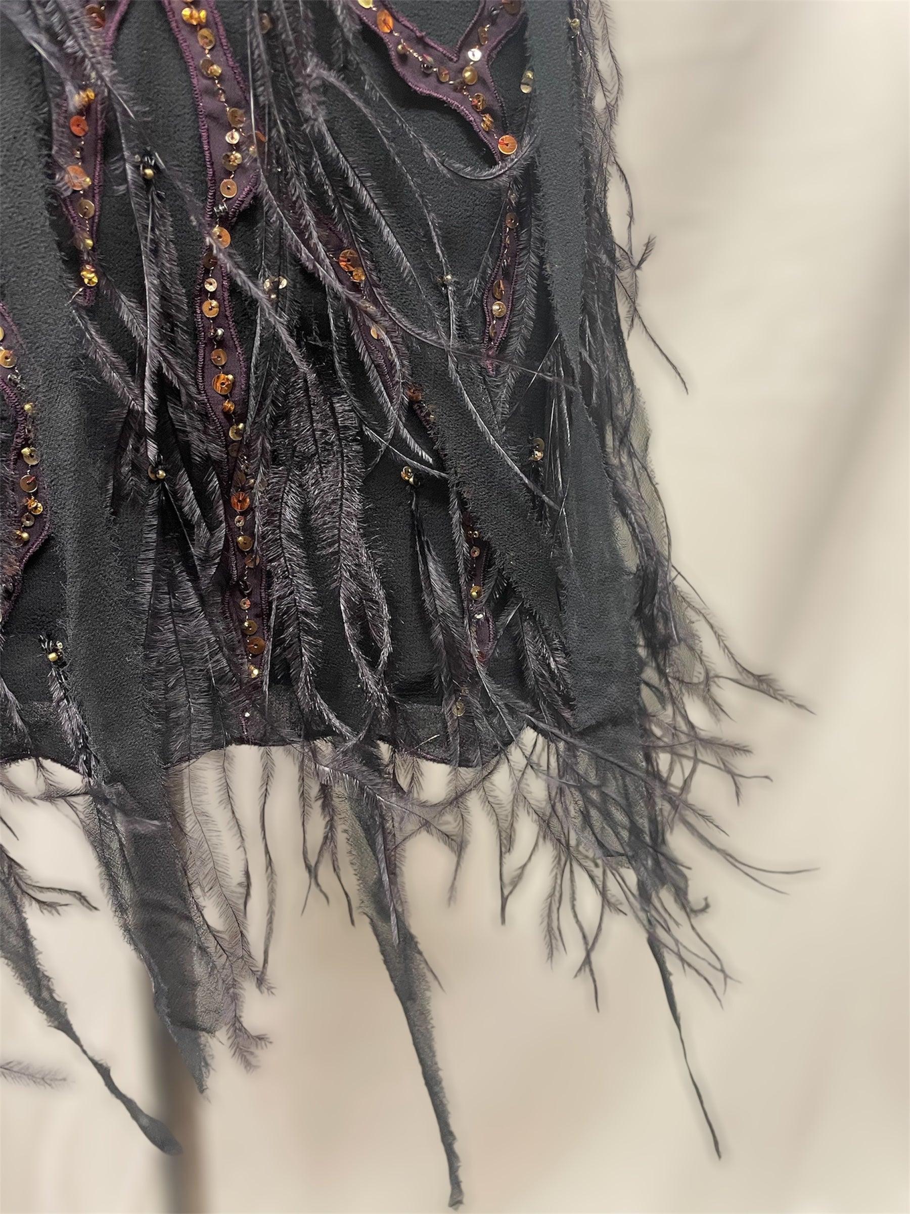 Stunning black and eggplant Mandalay party dress from the early 2000s, covered in bronze and gold sequins and beading that shimmer with every move. Designed with a deep V-neckline, intricate embroidery, and a feather-trimmed hem, this rare piece embodies true Y2K glam with a whimsy goth-fairy edge. Perfect for holiday parties, red carpet moments, or collectors of luxury deadstock fashion.