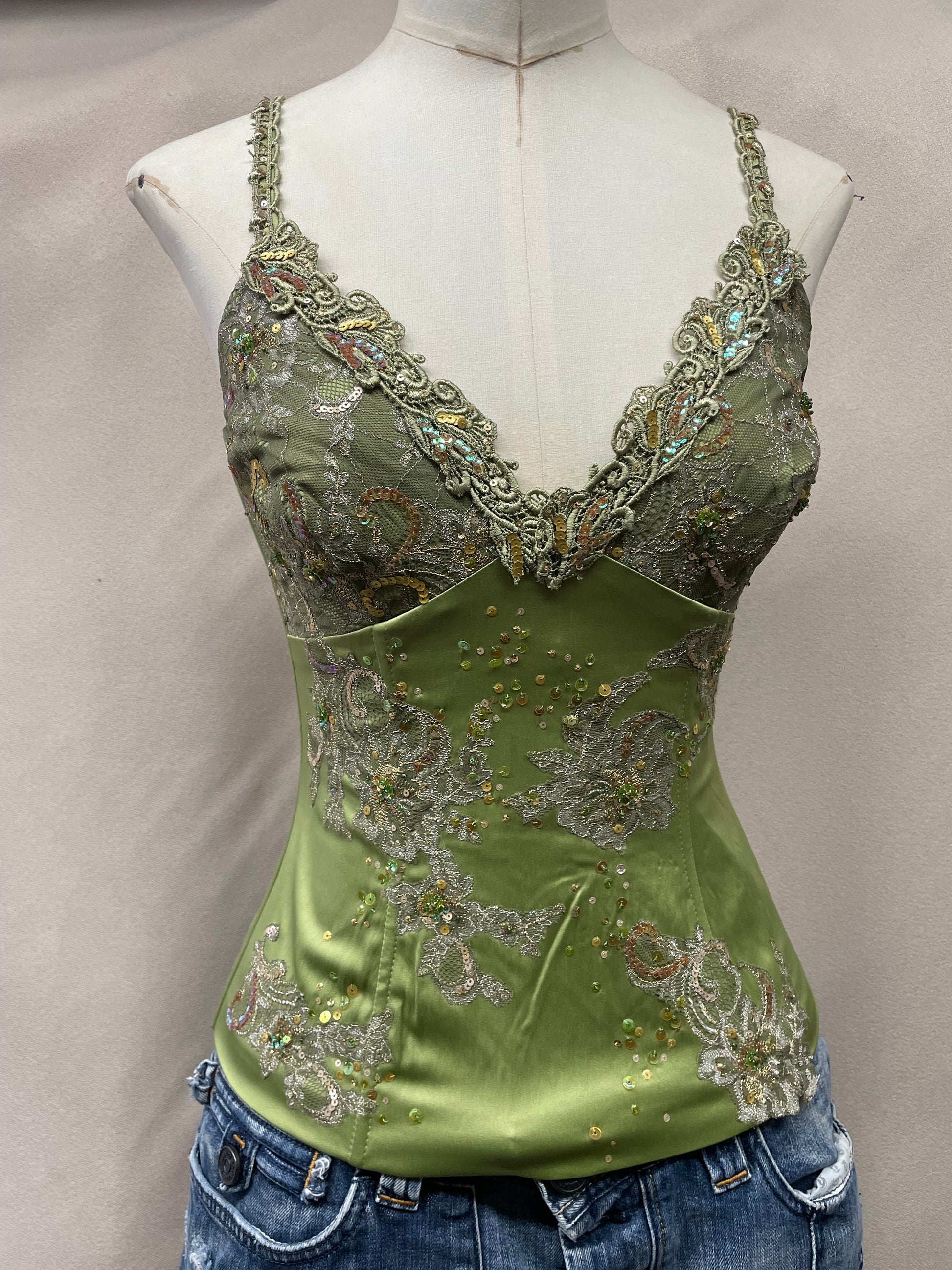 Vintage Y2K Deadstock Mandalay Satin Beaded Corset Top | Green Lace & Sequin Embellished (sz 14)