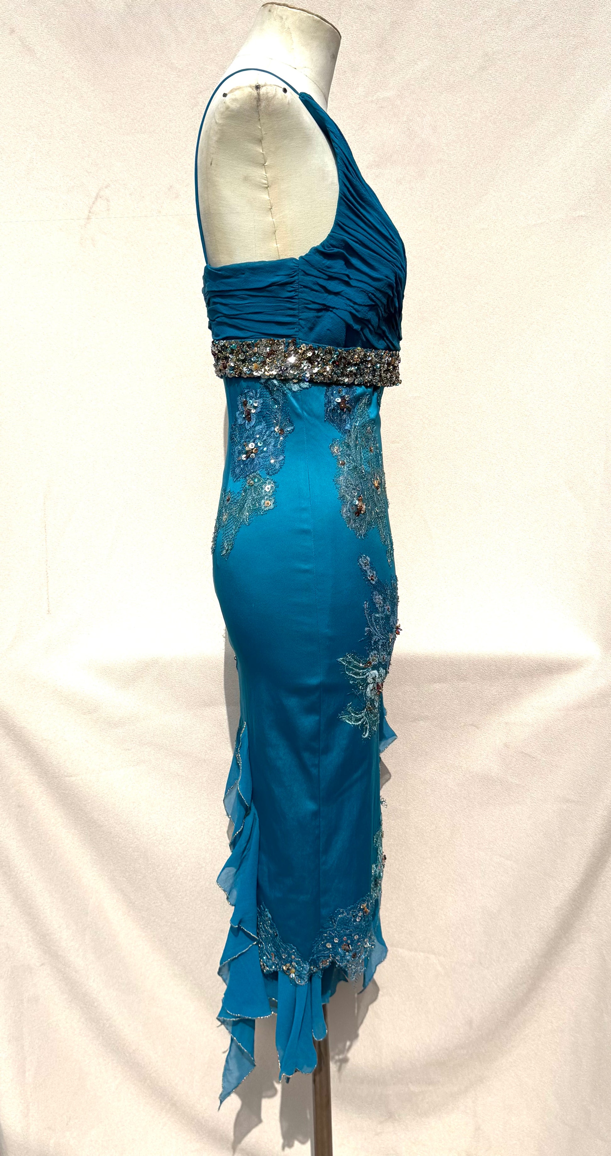 Enchanting early 2000s Mandalay midi dress featuring a whimsical asymmetrical ruffle “fairy” hem. Crafted from stretch satin with lace appliqué, intricate embroidery, sparkling sequins, and delicate beading. The ruched bodice enhances the silhouette for a flattering fit, while the fully lined interior ensures comfort. A perfect statement piece for vintage lovers or special occasions, capturing the signature Y2K Mandalay glamour.