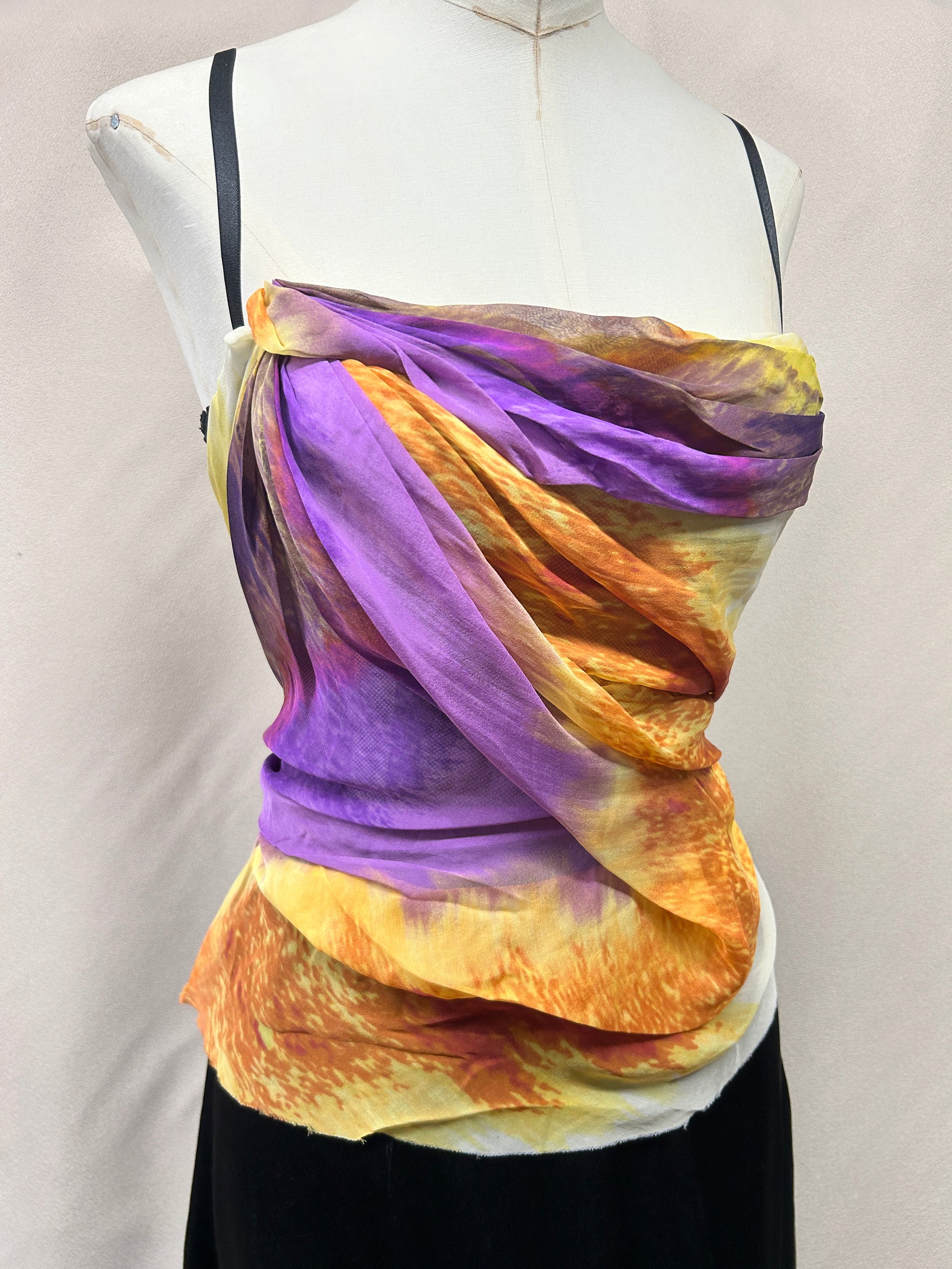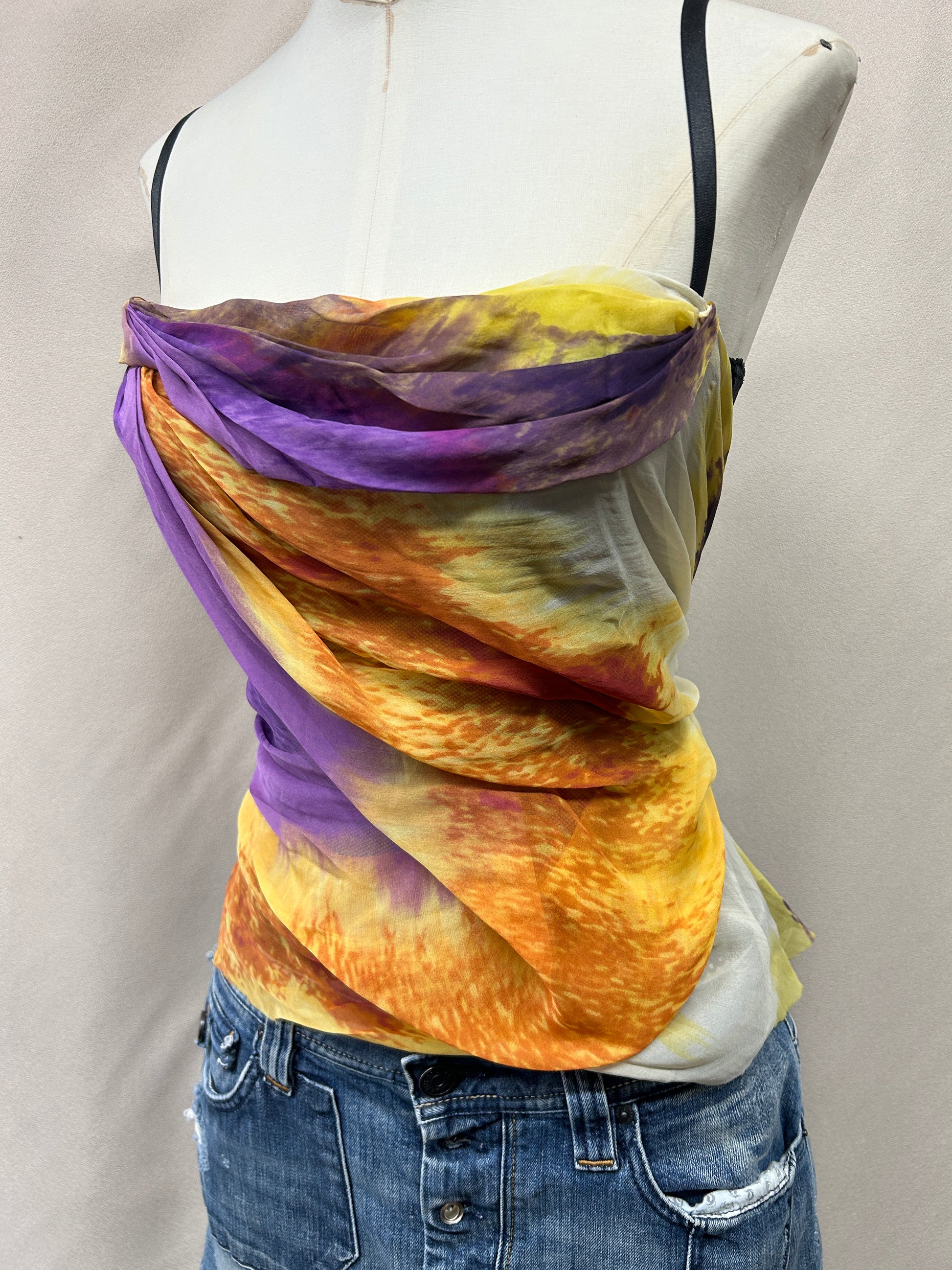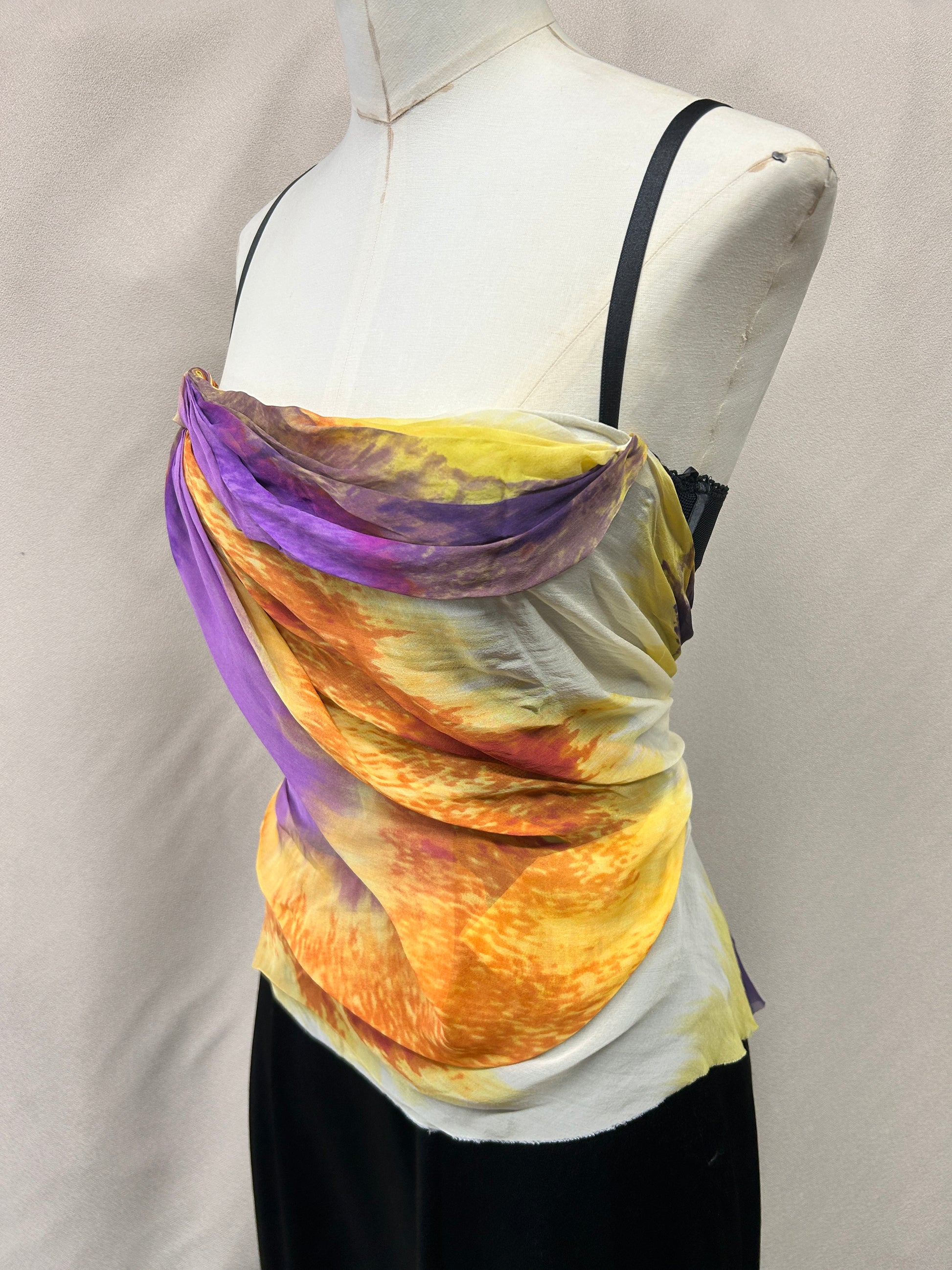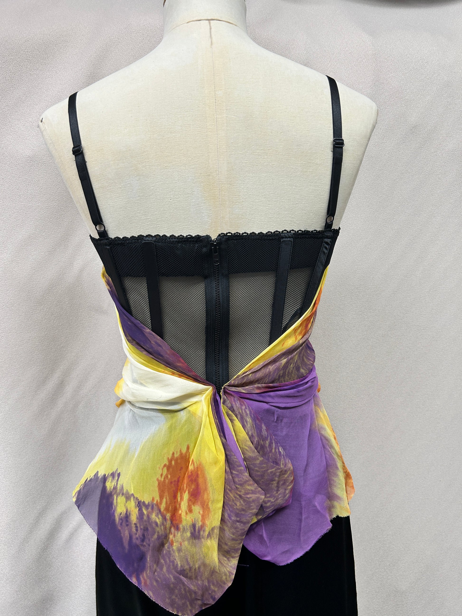 ATurn heads in this rare, deadstock early-2000s Mandalay corset top. Crafted from 100% silk, this vibrant piece features a painterly sunset-inspired print in fiery shades of orange, yellow, purple, and soft ivory. The semi-sheer silk overlay is artfully draped across the structured mesh corset base, creating a romantic, fluid silhouette.